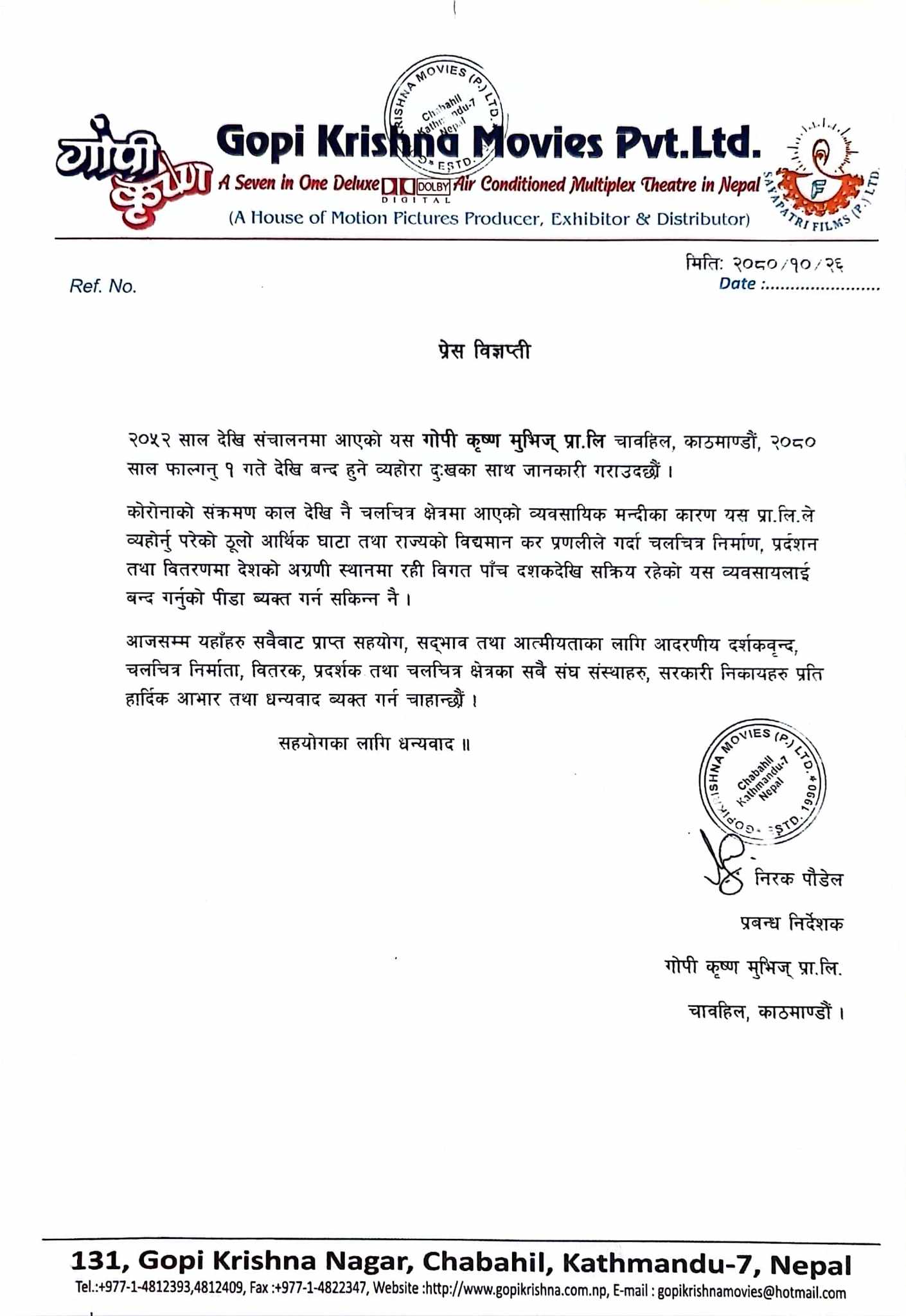 कोरोनाकालदेखि चलचित्र क्षेत्रमा आएको व्यावसायिक मन्दी र राज्यको राज्यको विद्यमान कर प्रणालीको कारण १ फागुनदेखि हल बन्द गने निर्णय लिइएको प्रबन्ध निर्देशक नीरक पौडेलले जारी गरेको विज्ञप्तिमा उल्लेख छ । गोपीकृष्ण सिनेमा हल २०५२ सालदेखि सञ्चालनमा आएको थियो ।