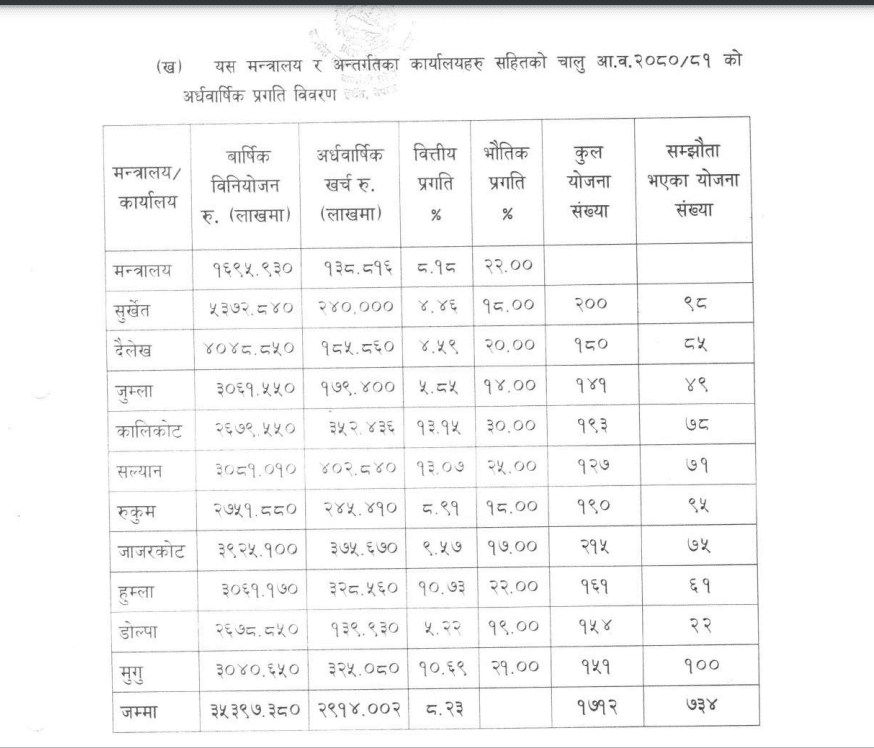 त्यसपछि दोस्रोमा जुम्ला रहेको छ । जुम्लामा मन्त्रालयले पठाएको १३९ योजनामा ४९ वटा योजनाको मात्र सम्झौता भएको पाइएको छ । मन्त्रीकै जिल्ला डोल्पामा विकासे योजनामा टेन्डर गर्न नदिने देखि राजनीतिक दबाबका कारण योजना सम्झौता कम भएको स्रोतले बताएको छ । अधिकांश योजनाहरु प्रदेशबाट किनेर ल्याइएको छ, बोलपत्र गर्न दिँदैनन कसरी हुन्छ काम ? एक कर्मचारीले बताए । मन्त्रालयको वित्तिय प्रगति ८.१८ प्रतिशत रहेको छ भने भौतिक प्रगती २२ प्रतिशत रहेको पाइएको छ ।