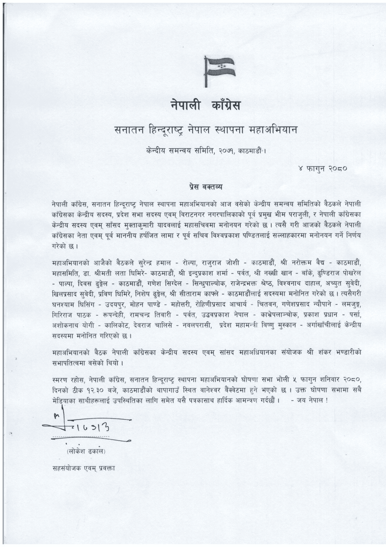 काठमाडौं। नेपाली कांग्रेसका नेताहरूले सनातन हिन्दूराष्ट्र नेपाल स्थापना महाअभियानको औपचारिक घोषणा आज गर्ने भएका छन् ।कांग्रेस केन्द्रीय सदस्य तथा शंकर भण्डारीको संयोजकत्वमा आज महाअभियानको घोषणा हुन लागेको हो । अभियानका सहसंयोजक एवम् प्रवक्ता लोकेश ढकालका अनुसार शनिबार १२ः३० बजे काठमाडौंको थापागाउँ स्थित बानेश्वर बैंक्वेटमा घोषणसभा कार्यक्रम राखिएको छ ।