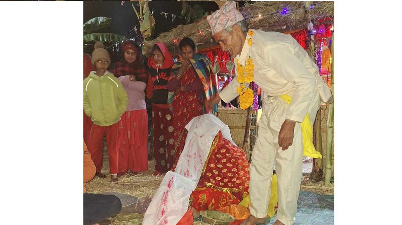 काठमाडौं। डोटीको जोरायल गाउँपालिका-५ भाम गाउँका ७१ वर्षीय वृद्धले आफ्नो प्रेमलाई विवाहमा परिणत गरेका छन्।स्थानीय ठक्कर बहादुर खडायतले ७१ वर्षको उमेरमा श्रीमतीको सिउँदो भरेका हुन्। उनले ६३ वर्षीया कुमारी भाटको सिउँदो भरेका छन्।उक्त दम्पतीका तीन छोरी र एक छोरा छन्। भाटको माइती सुर्खेत हो। धेरै पहिले खड्का र भाटले लामो प्रेम सम्बन्ध सँगै बिताए। उनीहरूबाट सन्तानसमेत भए। श्रीमतीको रूपमा घर भित्र्याएकी भाटको खड्काले सिउँदो भने भरेका थिएनन्।जोरायल-५ गड्सेरास्थित ज्यूनेबस्तास्थित वैयाल परिवारले सप्ताह महायज्ञको आयोजना गरेको छ।