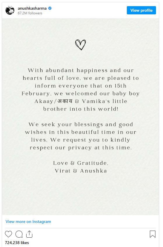 उनको नोटमा लेखिएको थियो, ‘प्रचुर खुशी र हाम्रो मायाले भरिएको हृदयका साथ, हामी सबैलाई यो जानकारी गराउन पाउँदा खुसी छौं कि फेब्रुअरी १५ मा हामीले हाम्रो बच्चा अकाय र वामिकाको सानो भाइलाई यस संसारमा स्वागत गर्यौं । हामी हाम्रो जीवनको यो सुन्दर समयमा तपाईंको आशीर्वाद र शुभकामना चाहन्छौं। हामी तपाईंलाई यस समयमा हाम्रो गोपनीयताको सम्मान गर्न अनुरोध गर्दछौं। प्रेम र कृतज्ञता, विराट र अनुष्का।’