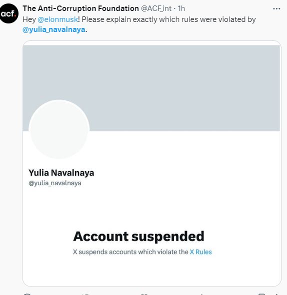 निलम्बन हुनु केही घण्टा अघि उनले क्रेमलिनका प्रवक्ता दिमित्री पेस्कोभले पनि आक्रोशित प्रतिक्रिया पोस्ट गरेकी थिइन्, जब उनले पत्रकारहरूलाई उनको पतिको मृत्युमा पुटिनको संलग्नताको आरोप अभद्र र निराधार भएको भन्दै खण्डन गरेका थिइन ।