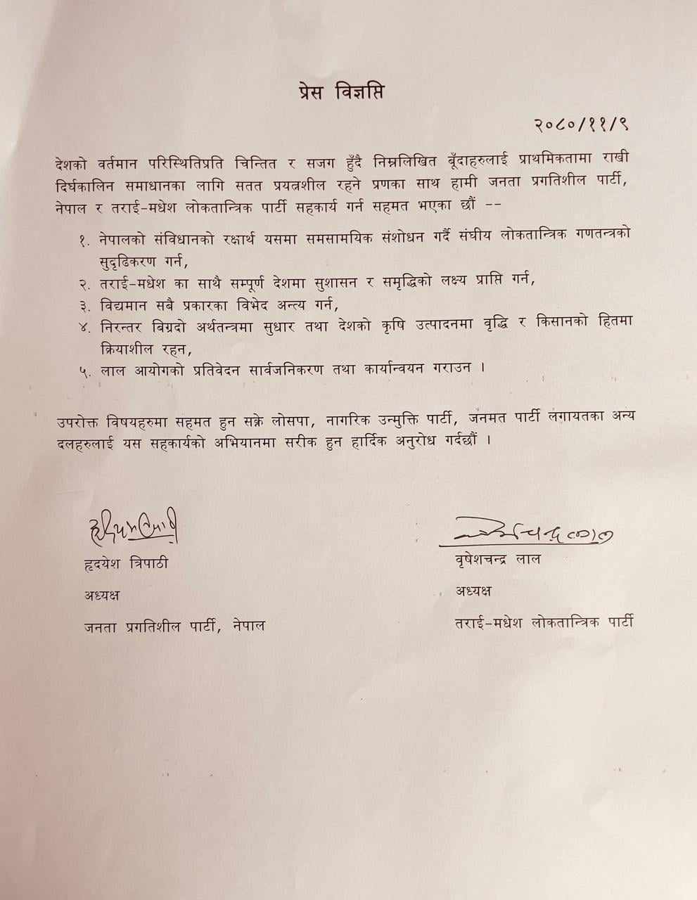 उक्त विषयमा सहमत हुन सक्ने लोसपा, नागरिक उन्मुक्ति पार्टी, जनमत पार्टीलगायतका दलहरुलाई पनि सहकार्यको लागि अनुरोध गरिएको छ ।