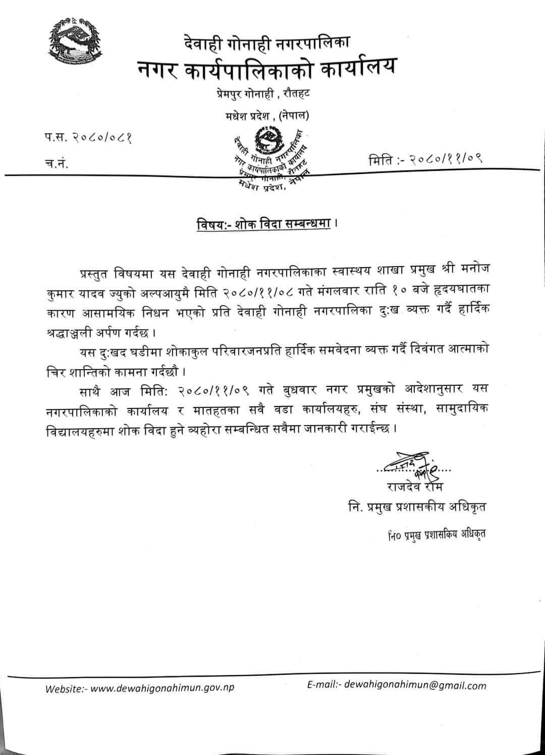 ‘देवाही गोनाही नगरपालिकाका स्वास्थय शाखा प्रमुख श्री मनोज कुमार यादव ज्युको अल्पआयुमै मिति २०८०÷११÷०८ गते मंगलवार राति १० बजे हृदयघातका कारण आसामयिक निधन भएको प्रति देवाही गोनाही नगरपालिका दुःख व्यक्त गर्दै हार्दिक श्रद्धाञ्जली अर्पण गर्दछ ।