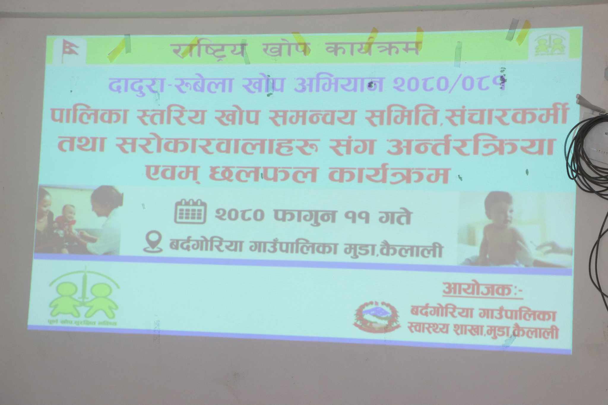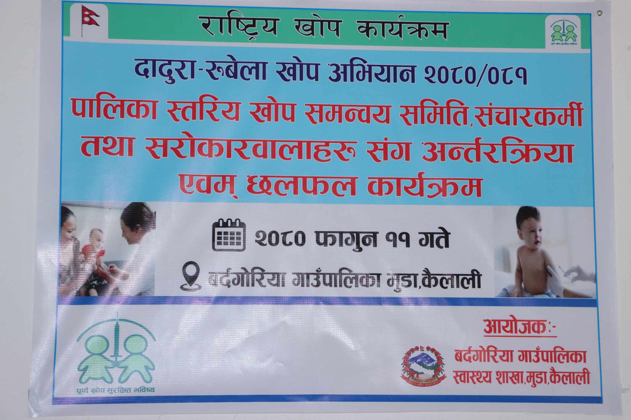 कैलाली । कैलालीको बर्दगोरिया गाउँपालिकामा यही फागुन १३ गतेदेखि दादुरा रुबेलाविरुद्धको खोप अभियान सुरु हुने भएको छ । खोप अभियानलाई सफल पार्न शुक्रबार पालिका स्तरीय समन्वय समिति,संचारकर्मी र सरोकारवाला निकाय संग अभिमुखिकरण कार्यक्रम सम्पन्न भएको छ । पालिकाको स्वास्थ्य शाखाको आयोजनामा भएको कार्यक्रममा दारुरा रुबेला खोपलाई कसरी प्रभावकारी बनाउन सकिन्छ भन्ने बारेमा छलफल भएको छ । बर्दगोरिया गाउँपालिकामा रहेका ६ वटै वडाहरुमा एकैपटक सुरु हुन लागेको खोप अभियानको आवश्यक तयारी पूरा भएको पालिकाको स्वास्थ्य शाखाले जनाएको छ ।कार्यक्रममा स्वास्थ्य शाखा प्रमुख मीन धामीले फागुन १३ गतेदेखि सुरु हुने खोप अभियान फागुन २३ गतेसम्म चल्ने बताए ।