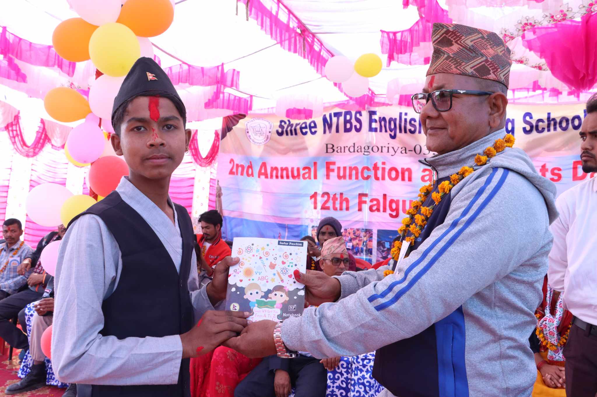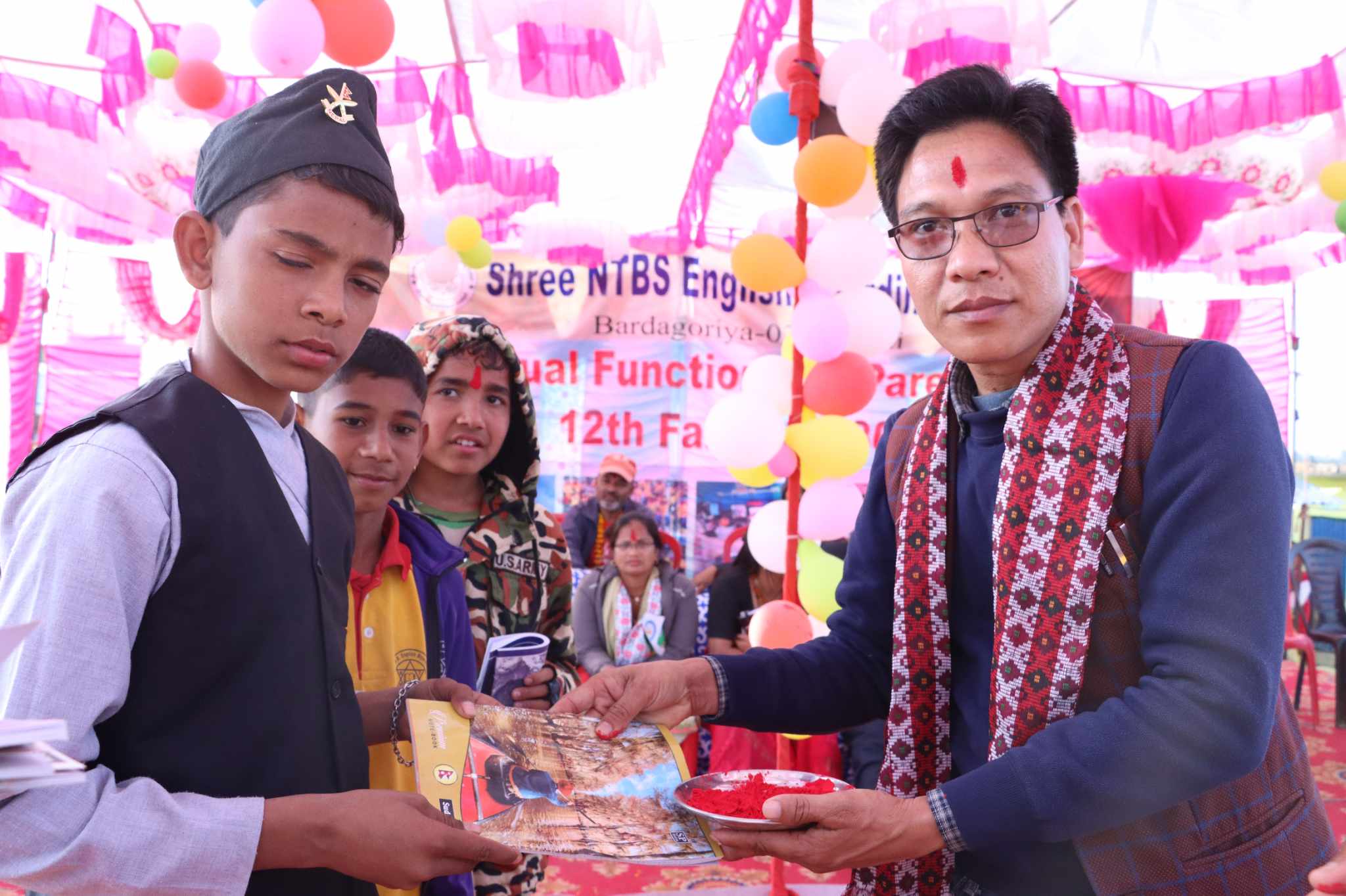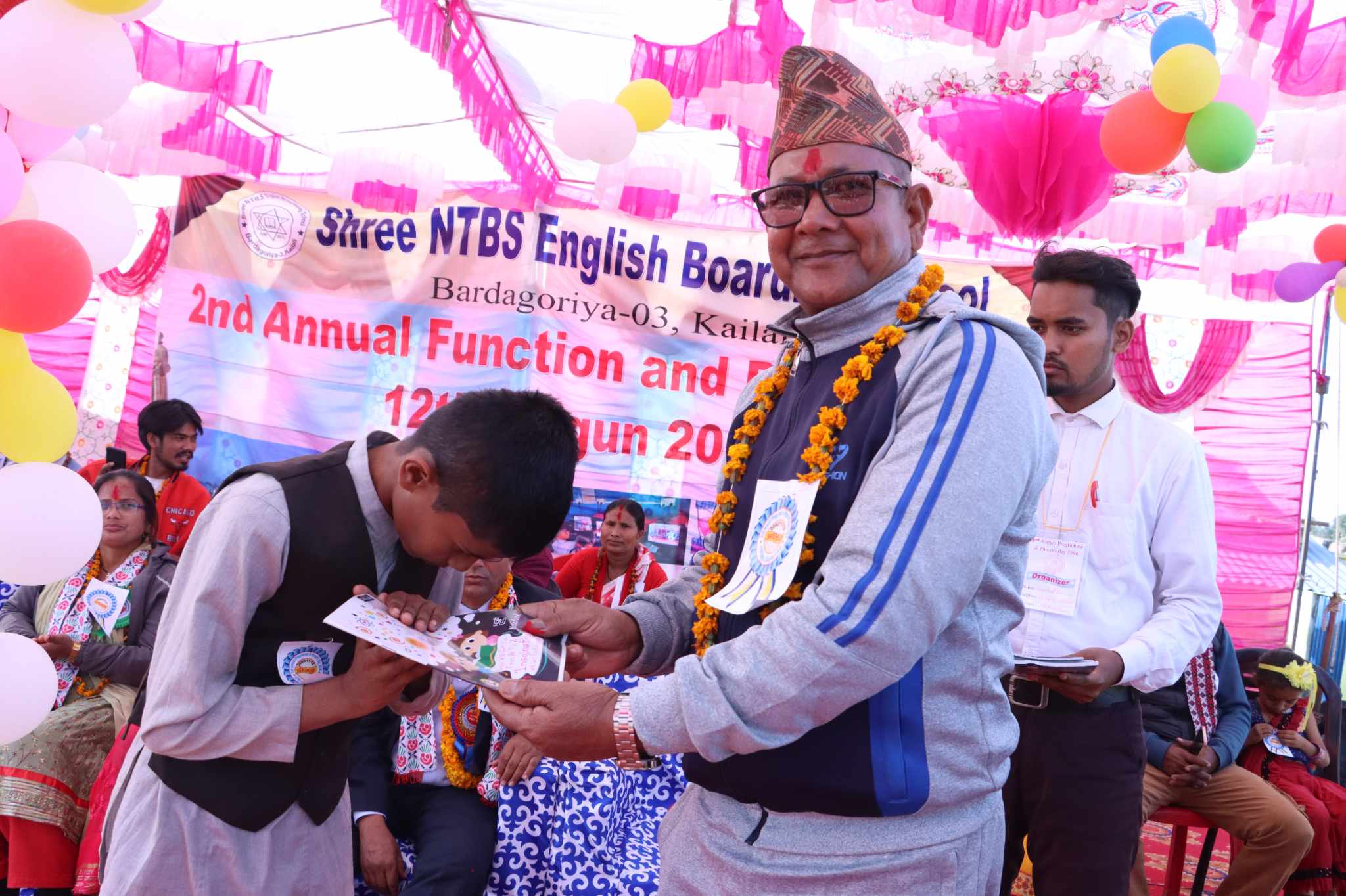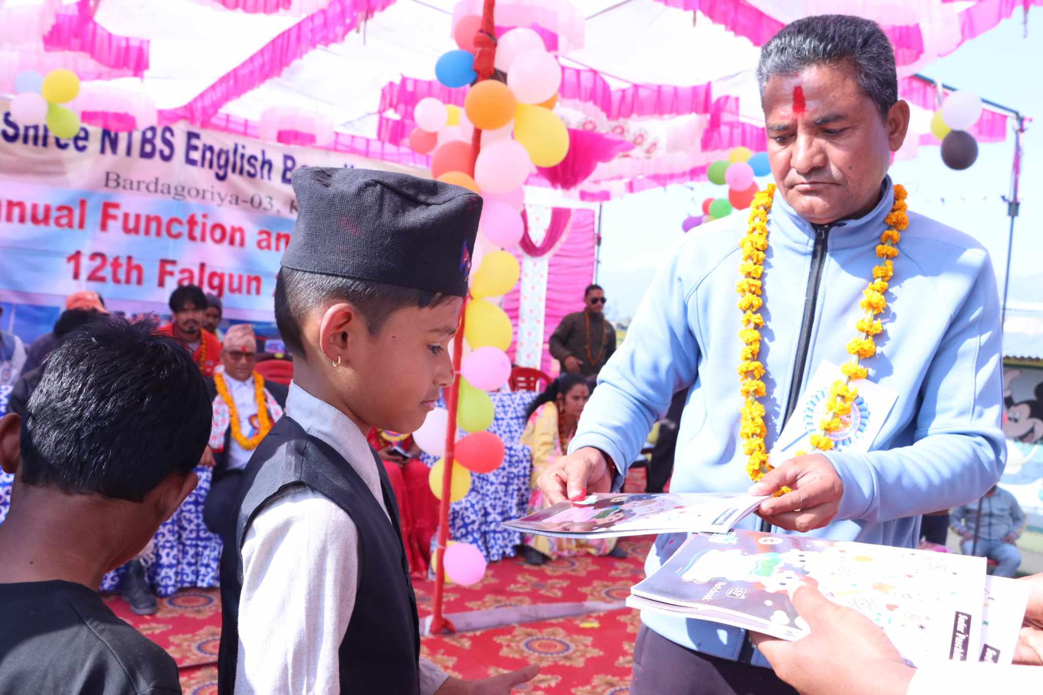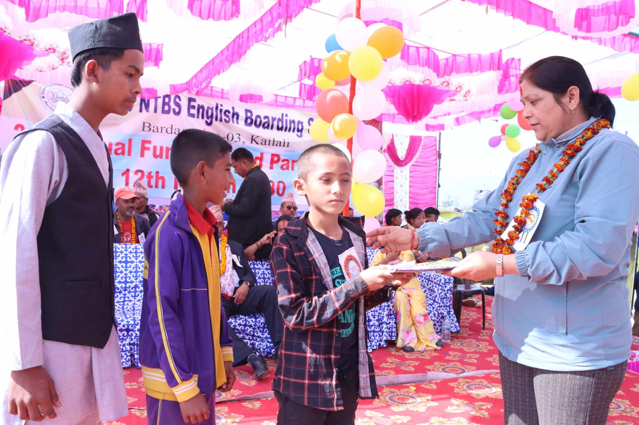 कैलाली । कैलालीको बर्दगोरिया गाउँपालिका वडा नं ३ मा रहेको एनटिबिएस इंग्लिश बोडिङ्ग स्कुलको दोस्रो वार्षिक उत्सव शनिबार सम्पन्न भएको छ। विद्यालयको प्राङगणमा आयोजित वार्षिक उत्सव कार्यक्रममा विभिन्न कक्षामा अध्यनरत विद्यार्थीहरुले नाच , नृत्य, विज्ञान प्रविधि,अभिनय लगायतका विभिन्न कलाहरू देखाएका थिए I विभिन्न विधामा प्रथम द्वितीय र तृतीय हुने विद्यार्थी लाई पुरुस्कार वितरण गरिएको थियो ।