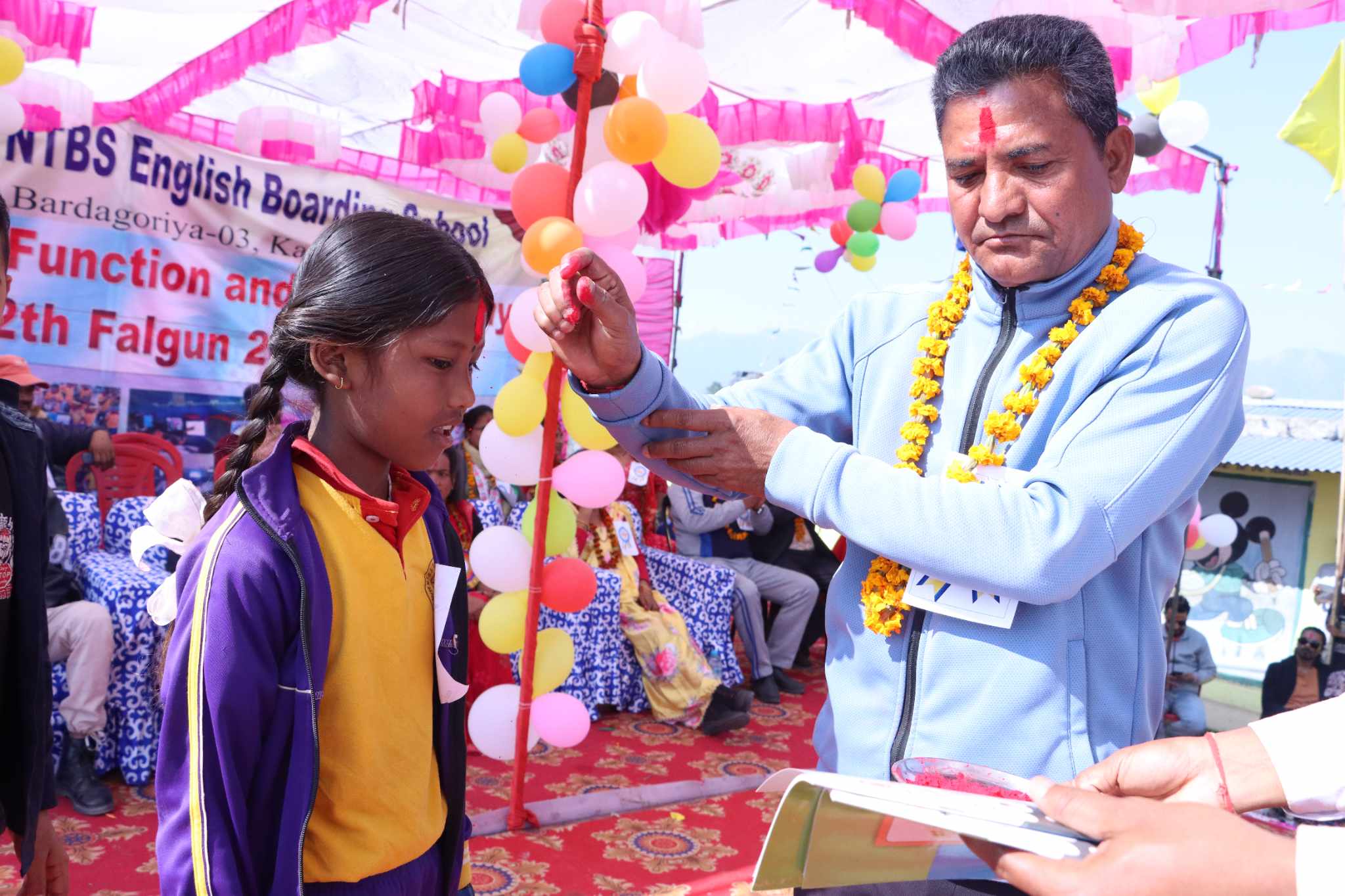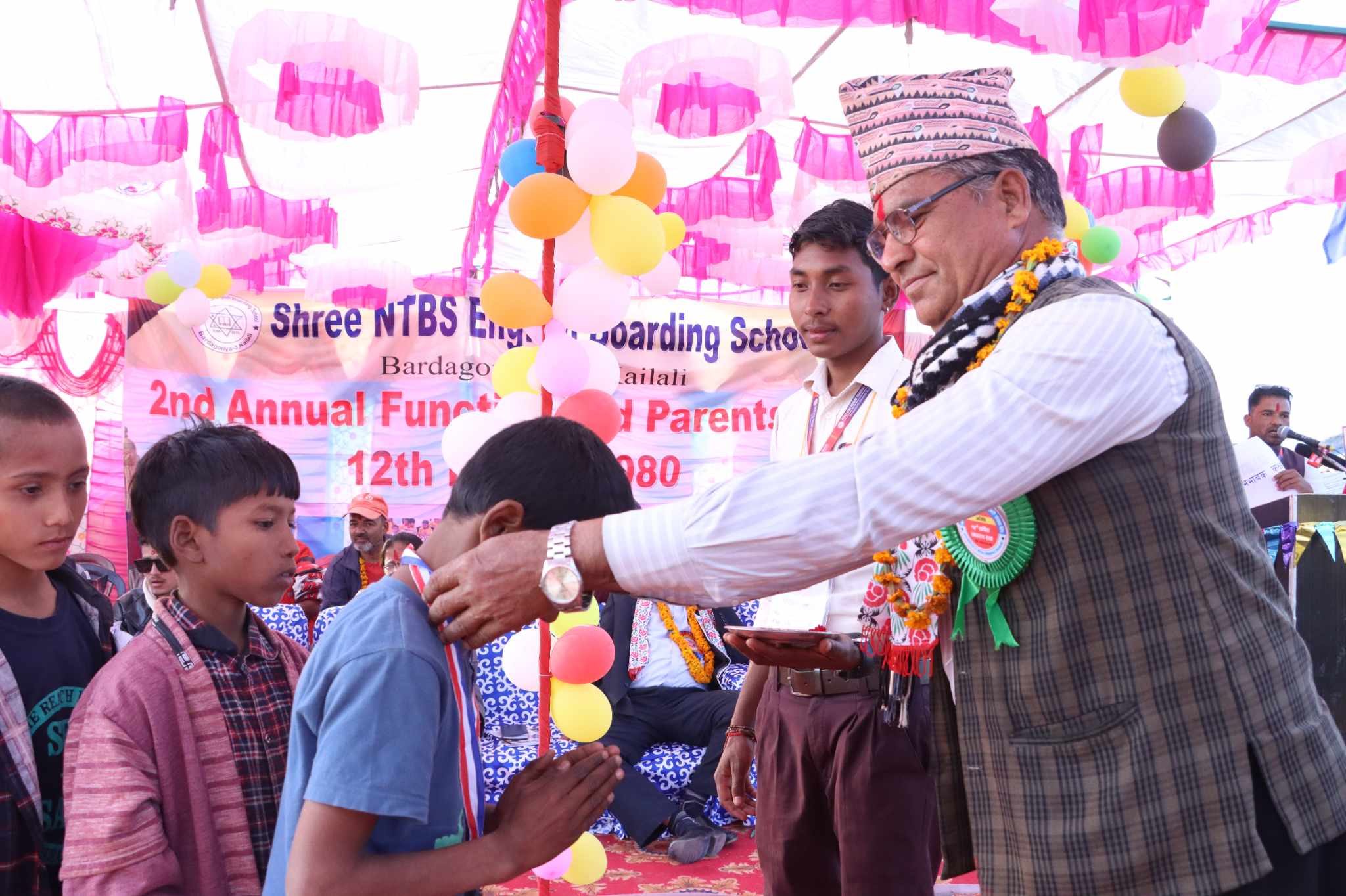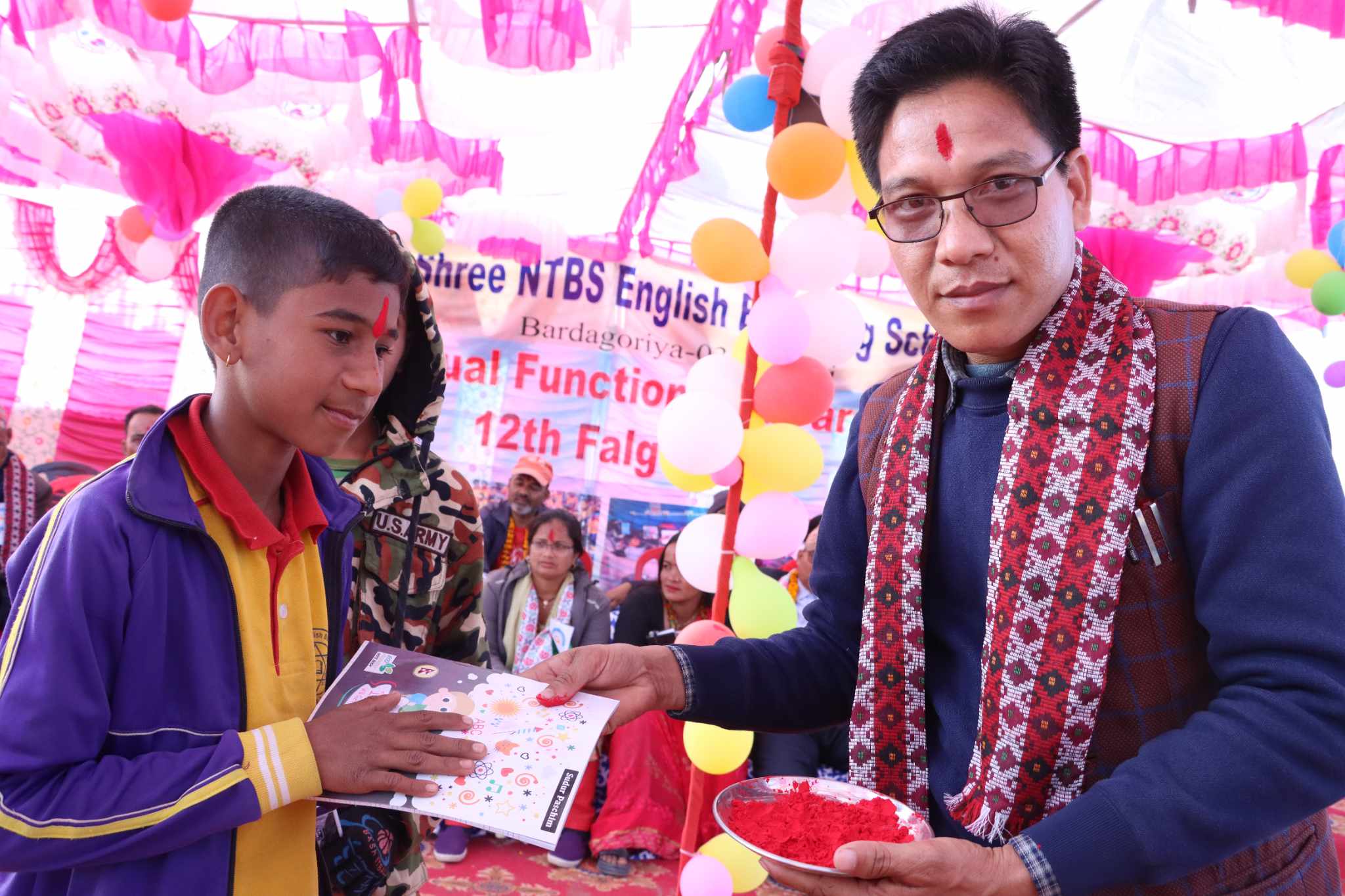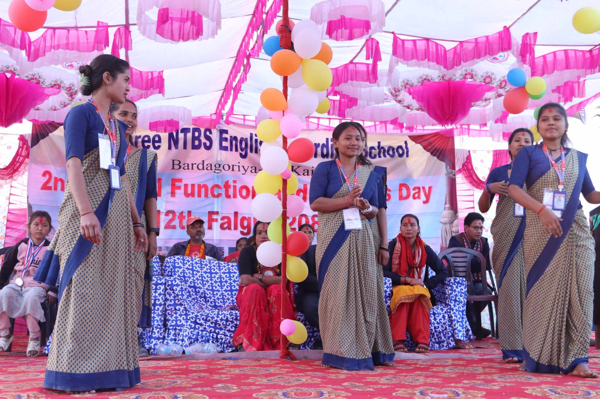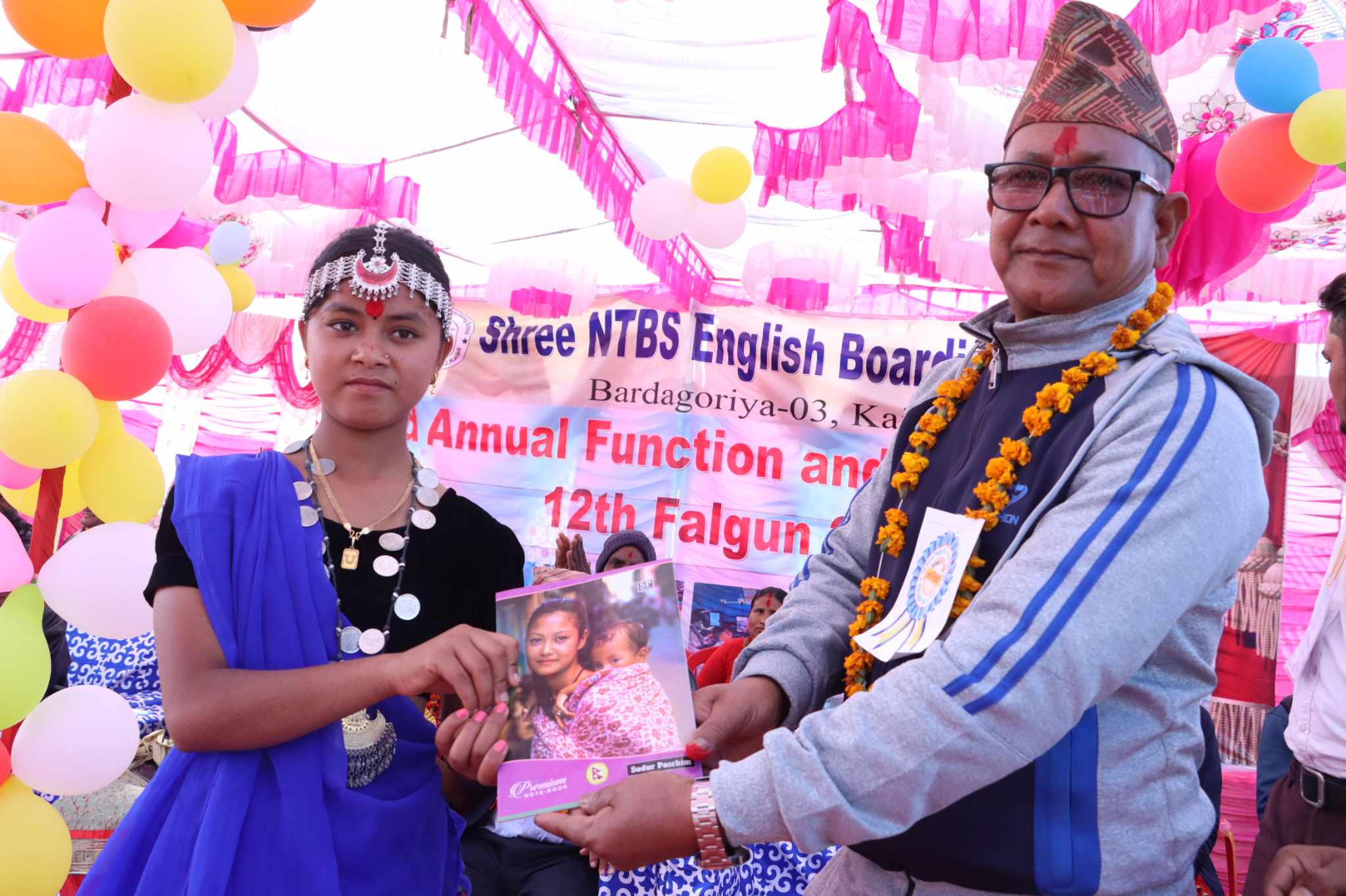 कैलाली । कैलालीको बर्दगोरिया गाउँपालिका वडा नं ३ मा रहेको एनटिबिएस इंग्लिश बोडिङ्ग स्कुलको दोस्रो वार्षिक उत्सव शनिबार सम्पन्न भएको छ। विद्यालयको प्राङगणमा आयोजित वार्षिक उत्सव कार्यक्रममा विभिन्न कक्षामा अध्यनरत विद्यार्थीहरुले नाच , नृत्य, विज्ञान प्रविधि,अभिनय लगायतका विभिन्न कलाहरू देखाएका थिए I विभिन्न विधामा प्रथम द्वितीय र तृतीय हुने विद्यार्थी लाई पुरुस्कार वितरण गरिएको थियो ।