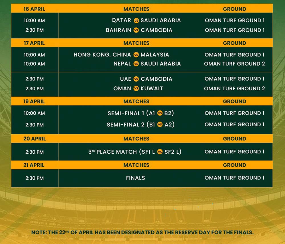 समूह ए मा रहेको नेपालले पहिलो खेल अप्रिल १२ मा मलेसियासँग खेल्ने भएको छ । त्यस्तै नेपालले दोस्रो खेल अप्रिल १३ मा कतारविरुद्ध खेल्नेछ भने तेस्रो खेल अप्रिल १५ मा हङकङविरुद्ध खेल्नेछ ।त्यसैगरी नेपालले आफ्नो अन्तिम खेल अप्रिल १७ मा साउदी अरेबियाविरुद्ध खेल्नेछ ।समूह चरणका खेलपछि दुवै समुहका शिर्ष २-२ देश सेमिफाइनलमा पुग्ने छन् । प्रतियोगिताको फाइनल खेल अप्रिल २१ मा हुनेछ । फाइनल खेलका लागि एक दिनको रिजर्भ डे समेत राखिएको एसीसीले जनाएको छ ।एसीसी प्रिमियर कपको विजेताले २०२५ को एशिया कपमा छनौट हुनेछ ।
