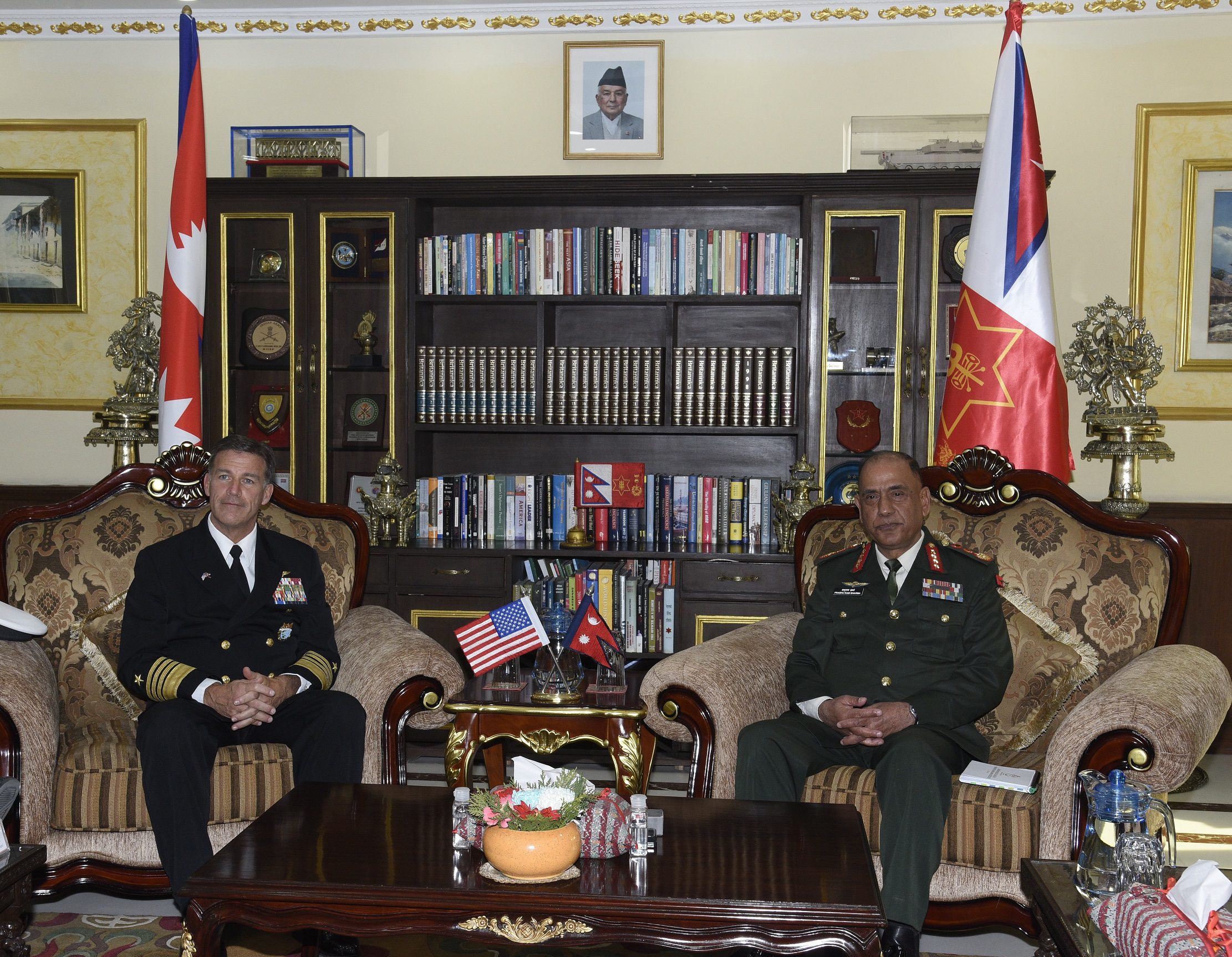 काठमाडौं। प्रधान सेनापति महारथी प्रभुराम शर्मा र अमेरिकाको इन्डो प्यासिफिक कमाण्डका कमाण्डर एडमिरल जोहन सी एक्यूलिनियोबीच जङ्गी अड्डामा शिष्टाचार भेटघाट भएको छ।प्रधान सेनापति शर्माको कार्यकक्षमा भएको भेटघाटमा वीरेन्द्र शान्ति कार्य तालिम केन्द्र, पाँचखालमा सञ्चालन भइरहेको बहुराष्ट्रिय अभ्यास शान्ति प्रयास-४ लगायत आपसी चासोका विषयमा छलफल भएको नेपाली सेनाले जनाएको छ।