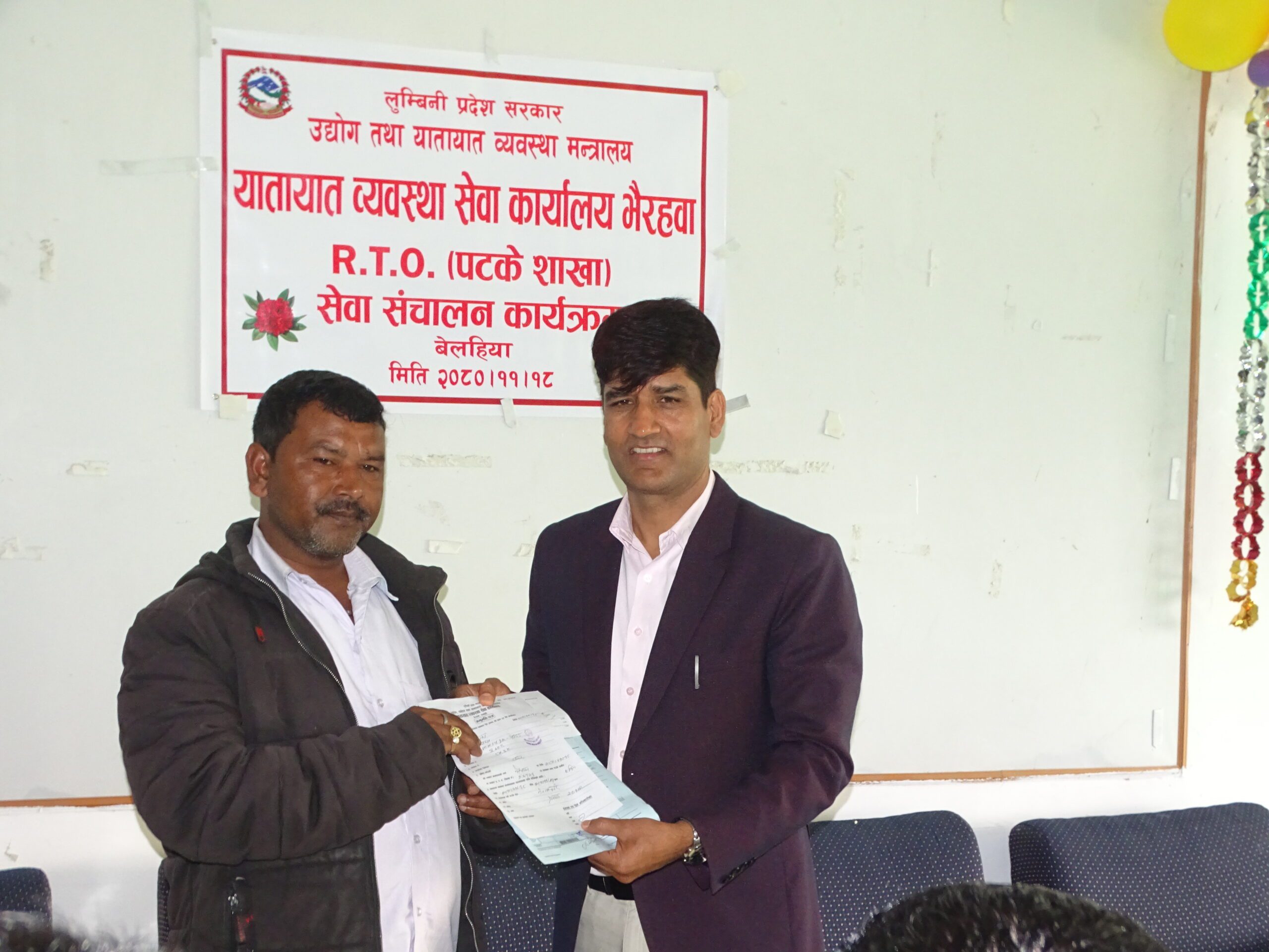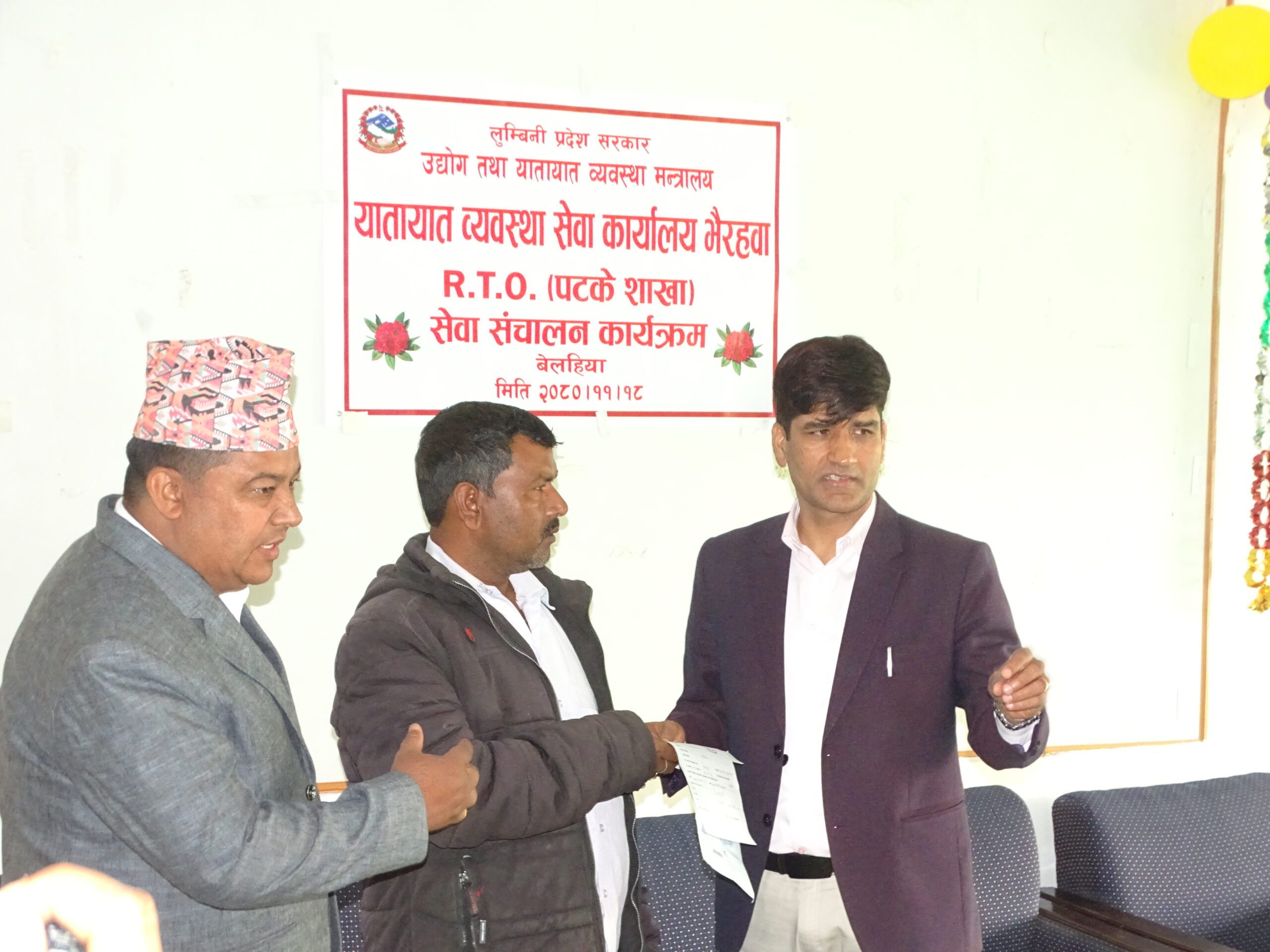 भैरहवा। यातायात व्यवस्था सेवा कार्यालय भैरहवाले भैरहवा भन्सार कार्यालयबाटै अस्थायी पटके इजाजत पत्र (रुट प्रमिट) सेवा सुरु गरेको छ । स्थलमार्ग हुदै सबै भन्दा बढि पर्यटक भित्रिने नाकाको रुपमा रहेको बेलहिया नाकामै पर्यटकलाई लक्षित गर्दै सेवा सुरु गरिएको हो ।अब भारतिय पर्यटकहरु भन्सारसँगै रुट पर्मिटको सेवा भन्सार परिसरबाटै पाउने छन । शुक्रबार प्रमुख जिल्ला अधिकारी गणेश अर्यालले भारतिय नागरिक धु्रव सिंहलाई काठमाण्डौ सम्म ४ दिनका लागि रुट प्रामिट दिई सेवा सुरु गरिएको हो ।