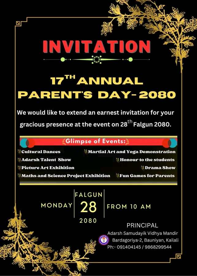 फागुन २८ गतेका दिन १७ औ वार्षिक उत्सब तथा अभिभावक दिवसको उदघाटन बर्दगोरिया गाउँपालिका अध्यक्ष कर्ण बहादुर कुँवरले गर्ने भएका छन्। कार्यक्रममा विभिन्न प्रतिभा जस्तै सास्कृतिक नृत्य,मार्शल आर्ट र योग प्रदर्शन, आदर्श प्रतिभा शो, चित्र कला प्रदर्शनी, गणित र विज्ञान परियोजना प्रदर्शनी, विद्यार्थीहरूको सम्मान, नाटक शो, अभिभावकको लागि मजा खेल संगै थुप्रै प्रकारका प्रस्तुति रहने विद्यालयका प्रधानाध्यापक बिकाश थापाले जानकारी दिएका हुन्।