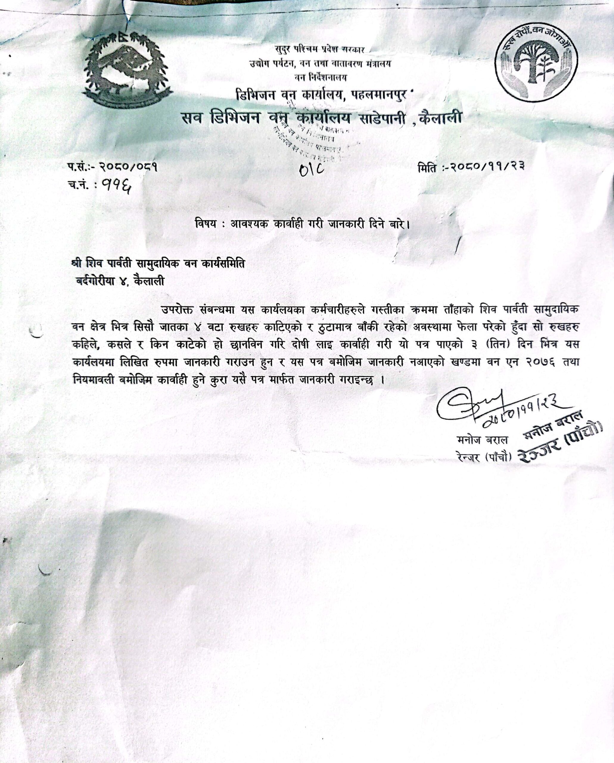 सामुदायिक वनमा सिसौका चारवटा रुख काटिएको र ठुटा मात्र बाँकी रहेकोे अवस्थामा फेला परेको हुँदा सो रुखहरु कहिले, कसले र किन काटेको हो ? छानबिन गरि दोषीलाई कारबाही गरि पत्र पाएको तीनदिन भित्र यस कार्यालयमा लिखित रूपमा जानकारी गराउन हुन र यस पत्र बमोजिम जानकारी नआएको खण्डमा वन ऐन २०७६ तथा नियमावली बमोजिम कारबाही हुने कुरा यसै पत्र मार्फत जानकारी गराइन्छ, पत्रमा भनिएको छ ।