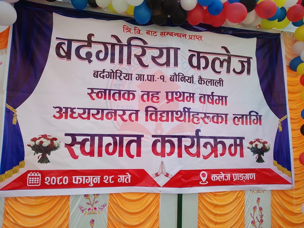 कैलाली । कैलालीको बौनियामा रहेको बर्दगोरिया कलेजमा आज स्नातक तह प्रथम वर्षमा अध्ययनरत विद्यार्थीहरुका लागि स्वागत कार्यक्रमको आज बर्दगोरिया गाउँपालिका अध्यक्ष कर्ण बहादुर कुँवरले प्यानसमा दिप प्रजनल र ब्यानर खोलेर उद्घाटन गरेका हुन्।