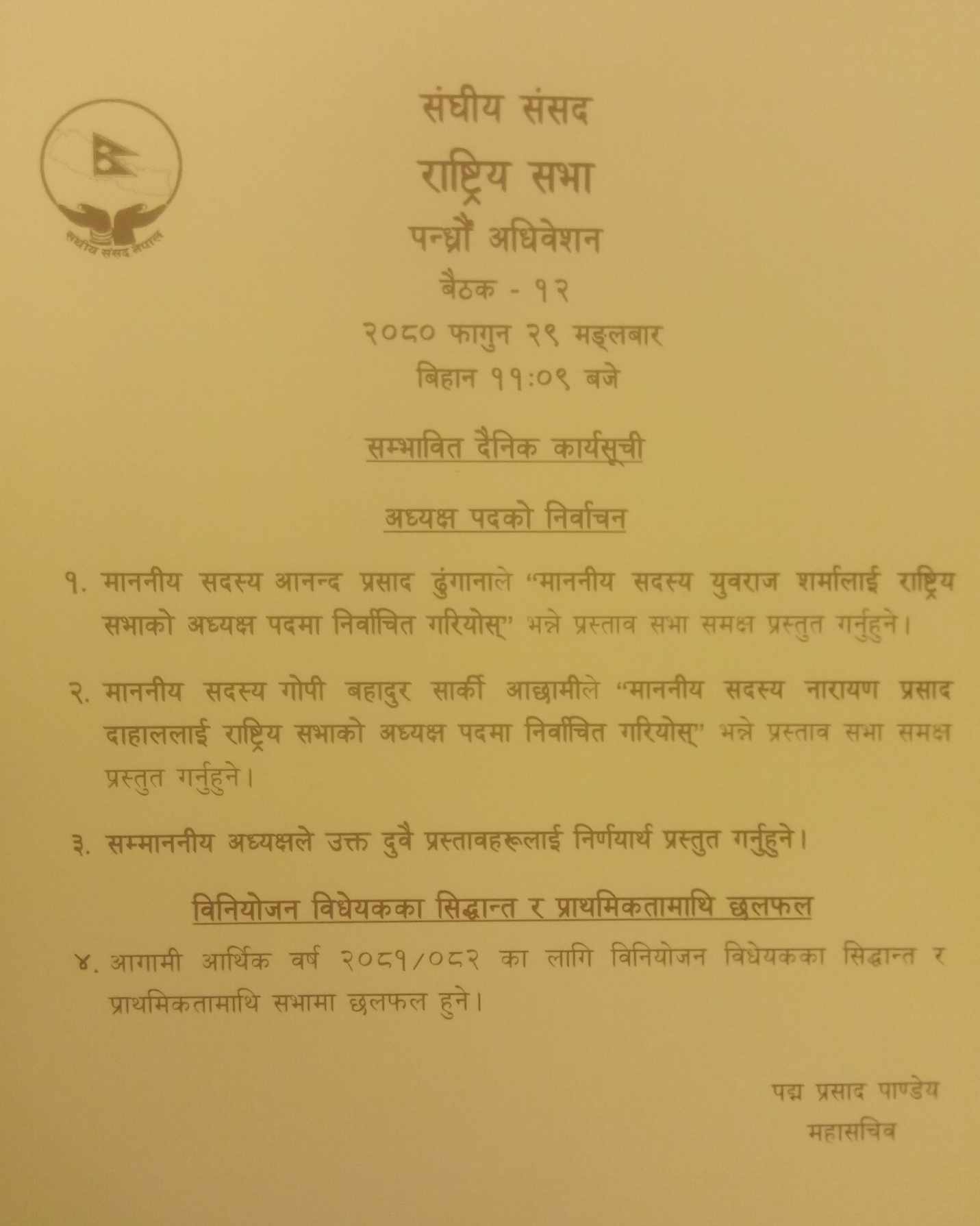 काठमाडौं। राष्ट्रियसभाको भावी अध्यक्षका लागि आज मतदान हुदैँछ । संसद सचिवालयले हिजो सार्बजनिक गरेको उम्मेदवारीको अन्तिम नामावली अनुसार नेकपा माओवादी केन्द्रका उम्मेद्वार नारायणप्रसाद दाहाल र नेपाली कांग्रेसका उम्मेद्वार युवराज शर्मा बिचमा प्रतिस्पर्धा हुदैछ ।