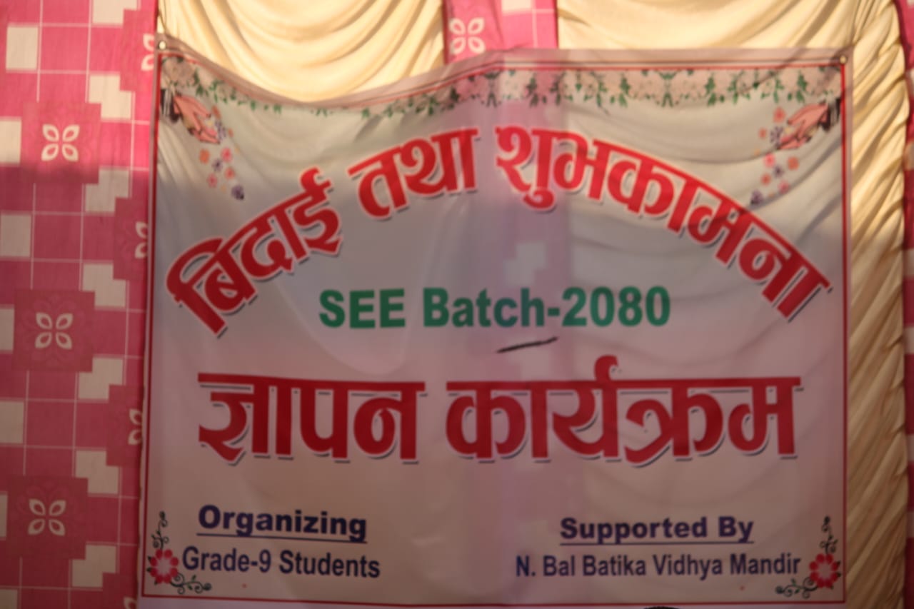 कक्षा ९ का विद्यार्थीहरूको आयोजनामा सुरु भएको कार्यक्रममा कक्षा ९ मा अध्ययनर छात्रा बिस्ना जैशीको सभापतिमा सुरु भएको कार्यक्रममा विद्यालयका संस्थापक प्रमोद मल्ल प्रमुख अथिति र विशिष्ट अथितिमा विद्यालयका प्रधानाध्यापक हर्क बहादुर ओड रहनु भएको थियो। कार्यक्रमको उदघाटन ब्यानर खोलेर विद्यालयका संस्थापक प्रमोद मल्लले गरेको हुन्।