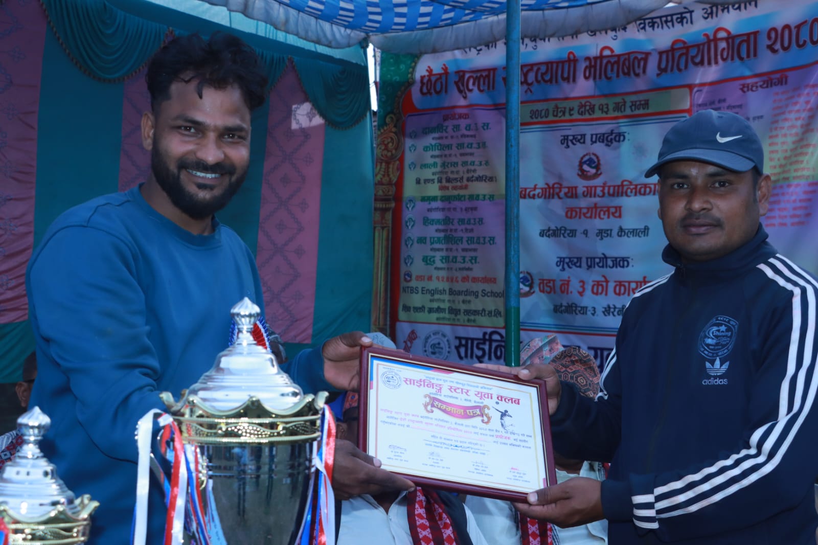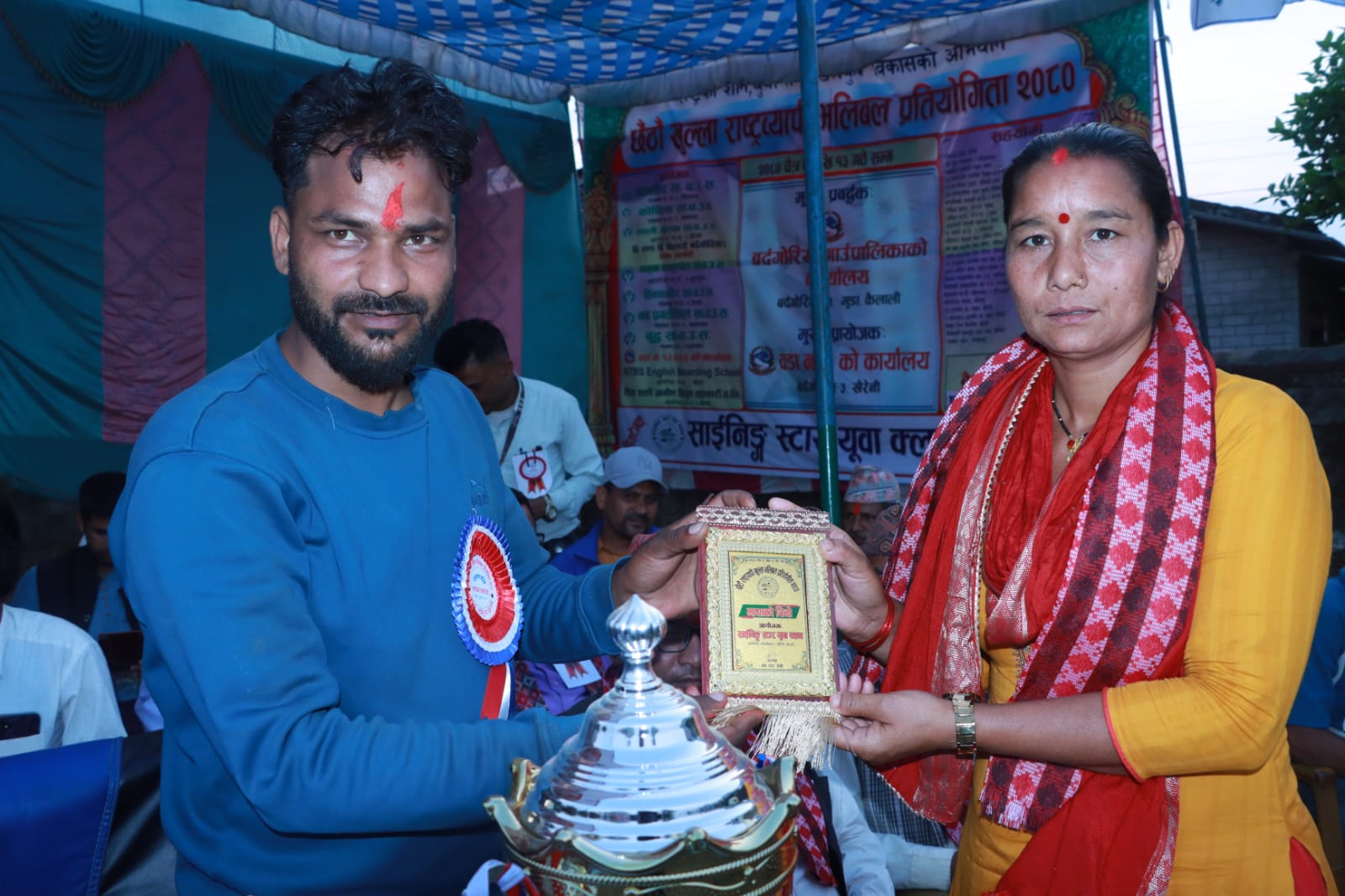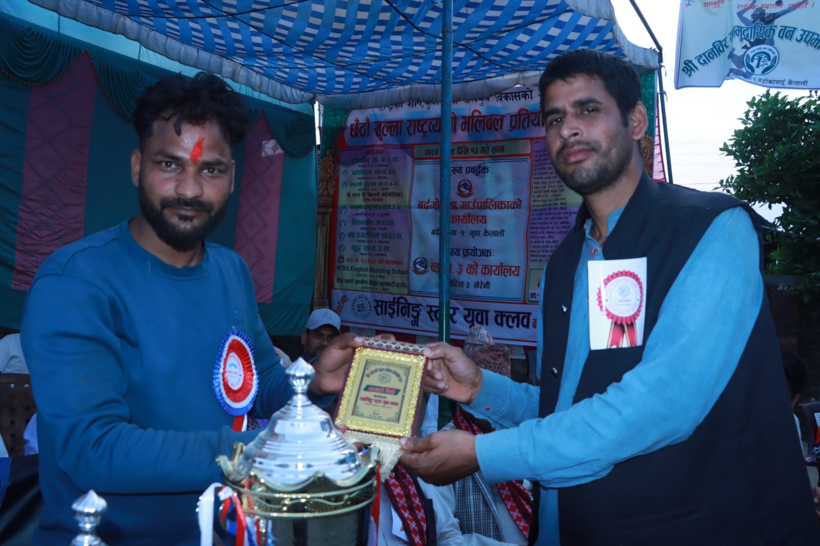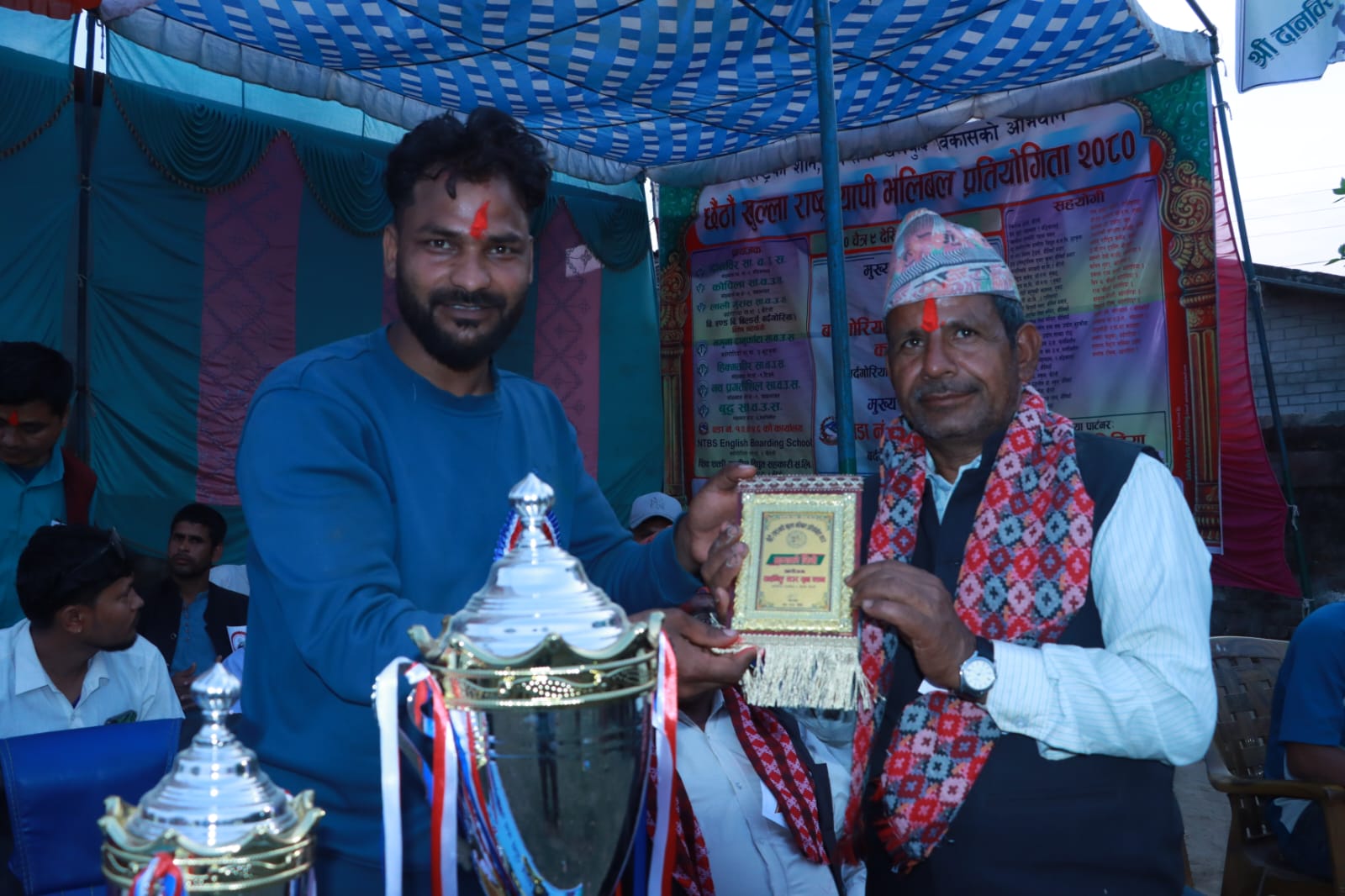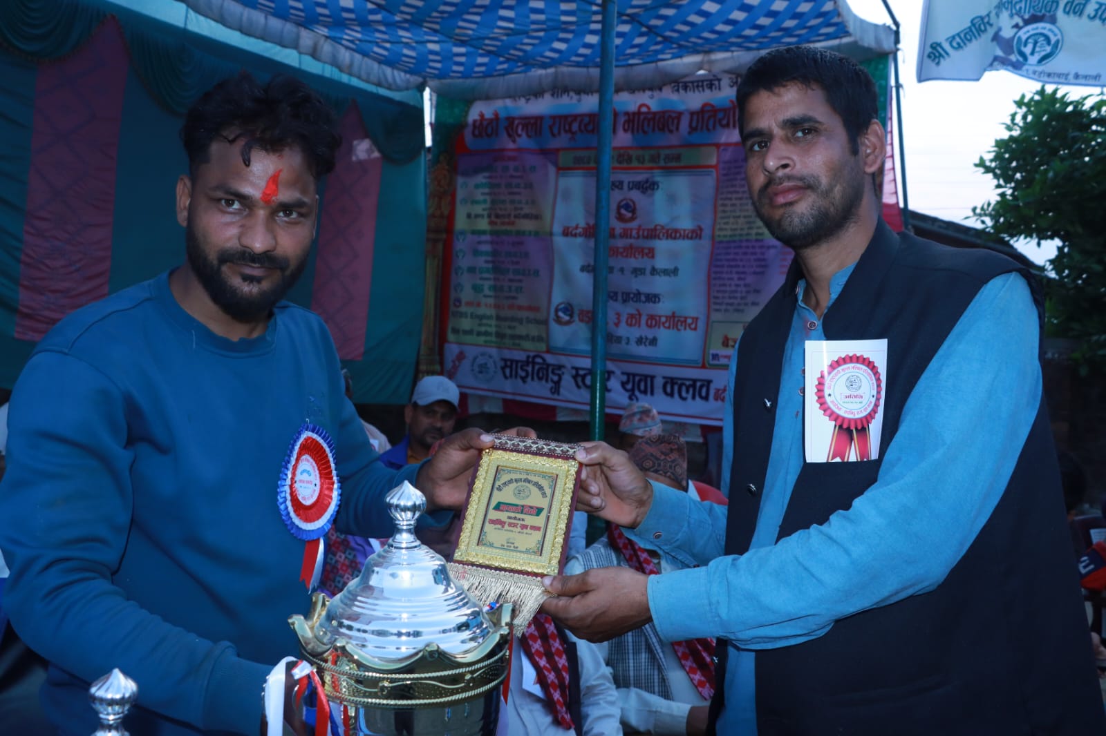त्यस्तै, वेष्ट ब्लकर साईनिङ्ग स्टार ‘ए’ का खेलाडी विरेन्द्र विश्वकर्मा ‘वुलेट’, वेष्ट सेटरतर्फ केदार टूर एण्ड ट्राभल्सका आशिष र वेष्ट प्लेयरतर्फ आयोजक साईनिङ्ग स्टार ‘ए’ का बलदेव धामीलाई नगद पुरस्कारबाट सम्मानित गरिएको छ ।