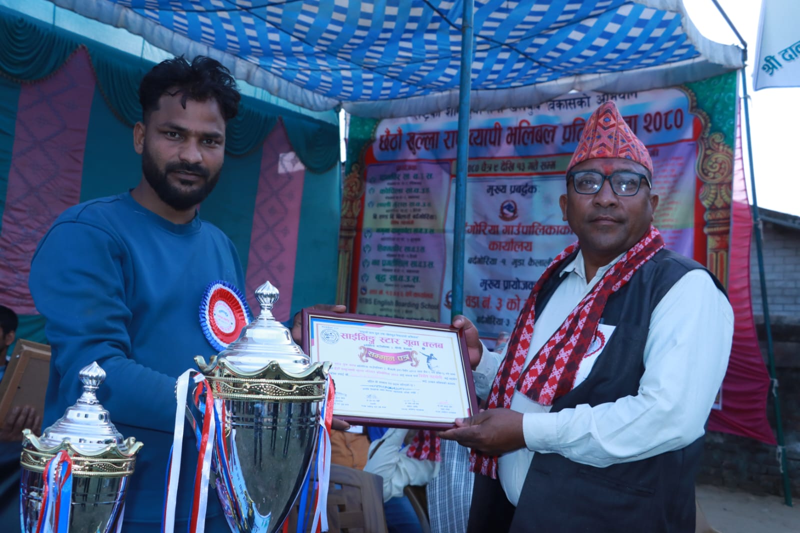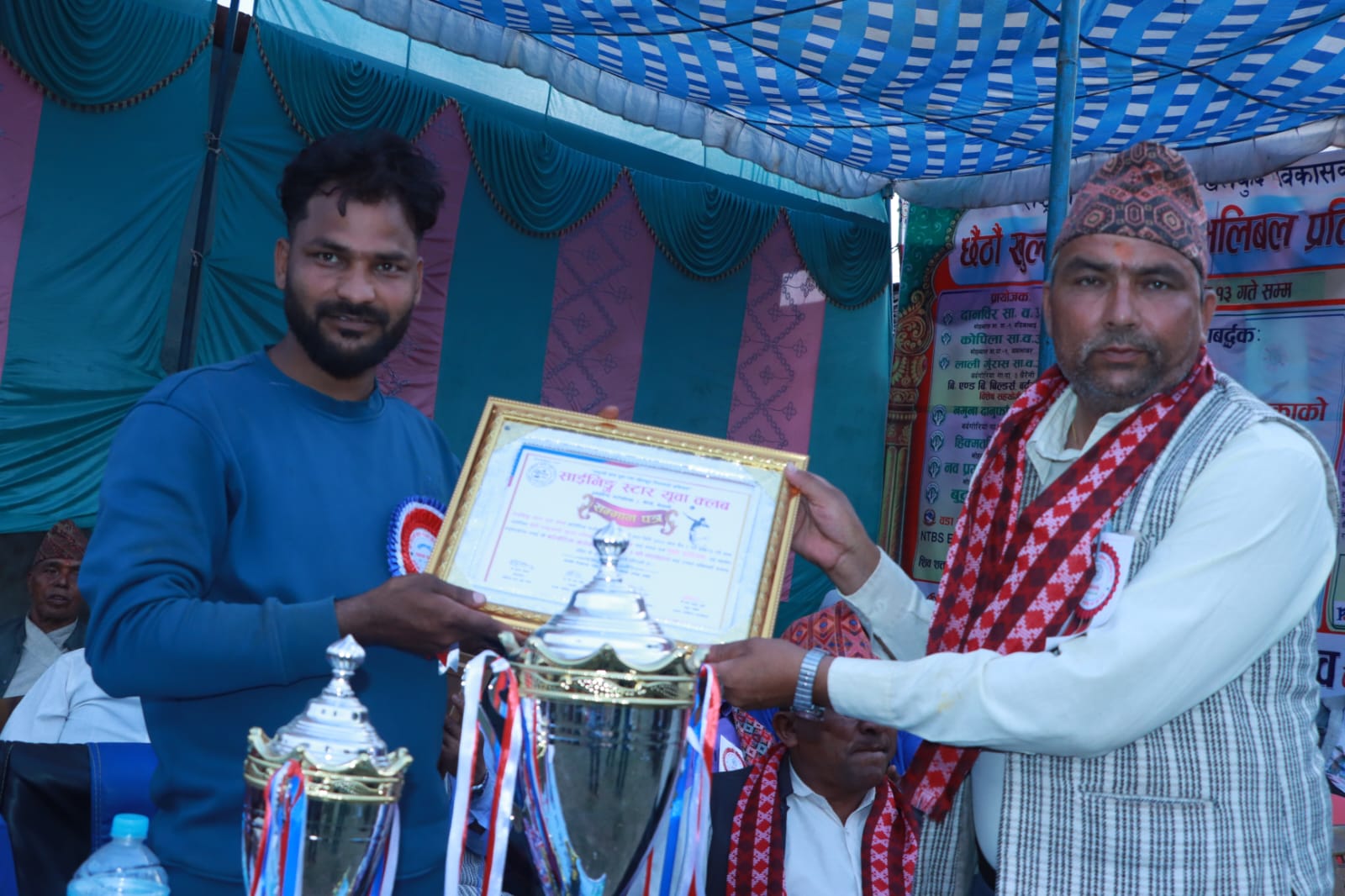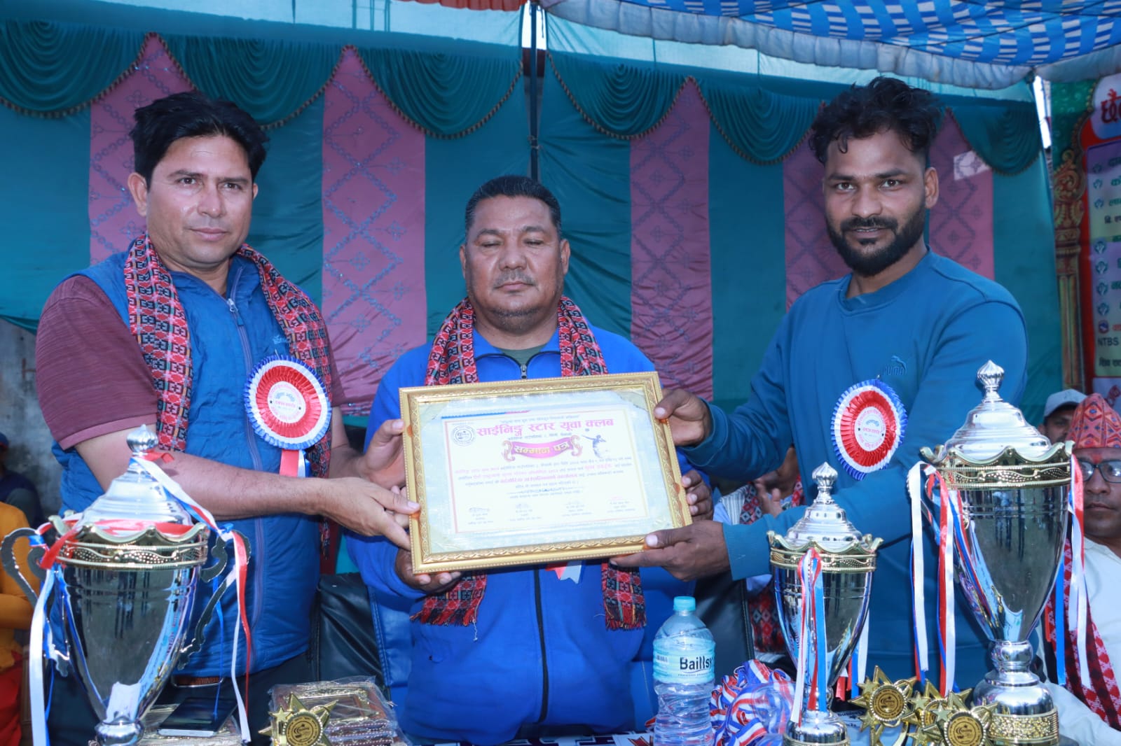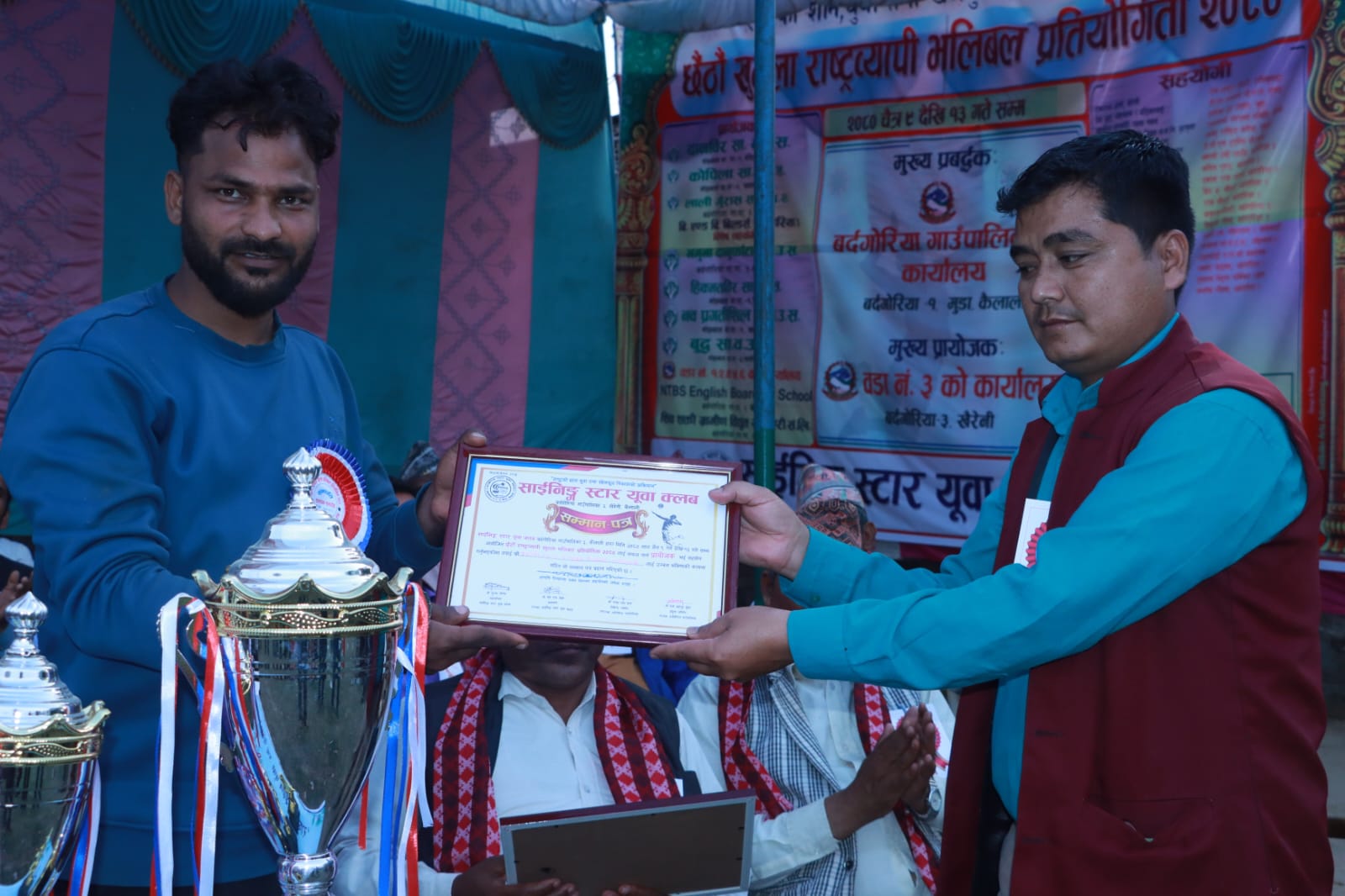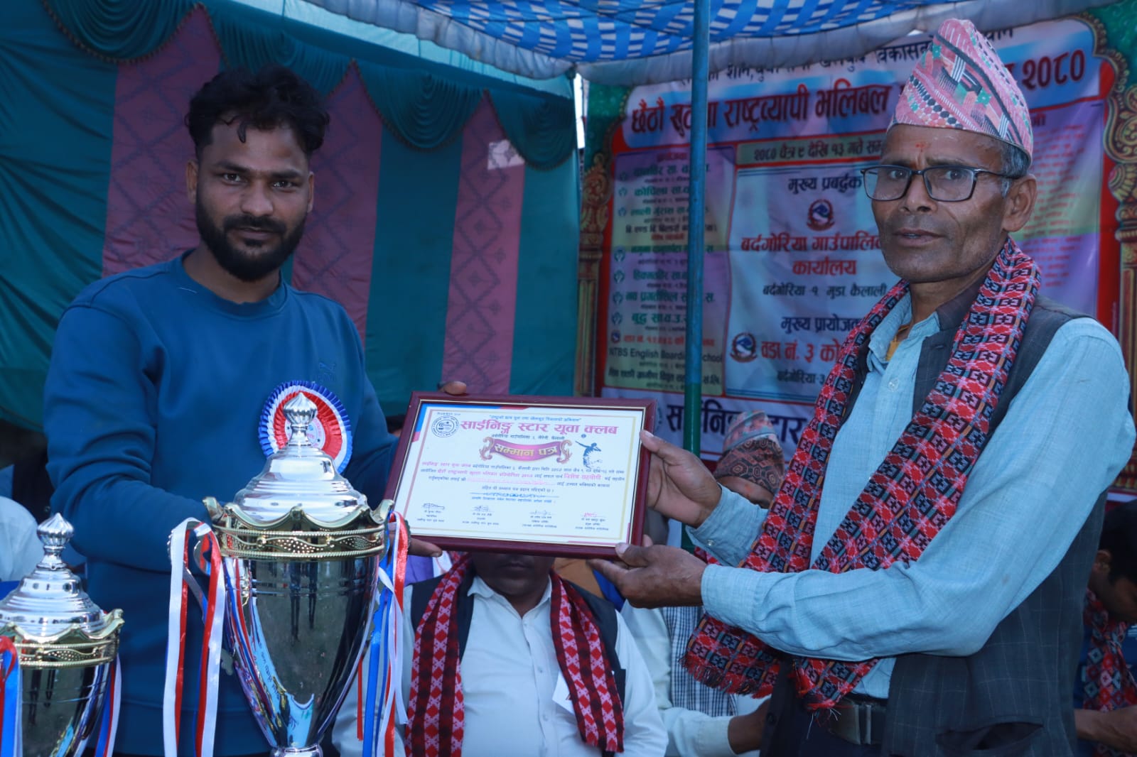 त्यस्तै, वेष्ट ब्लकर साईनिङ्ग स्टार ‘ए’ का खेलाडी विरेन्द्र विश्वकर्मा ‘वुलेट’, वेष्ट सेटरतर्फ केदार टूर एण्ड ट्राभल्सका आशिष र वेष्ट प्लेयरतर्फ आयोजक साईनिङ्ग स्टार ‘ए’ का बलदेव धामीलाई नगद पुरस्कारबाट सम्मानित गरिएको छ ।