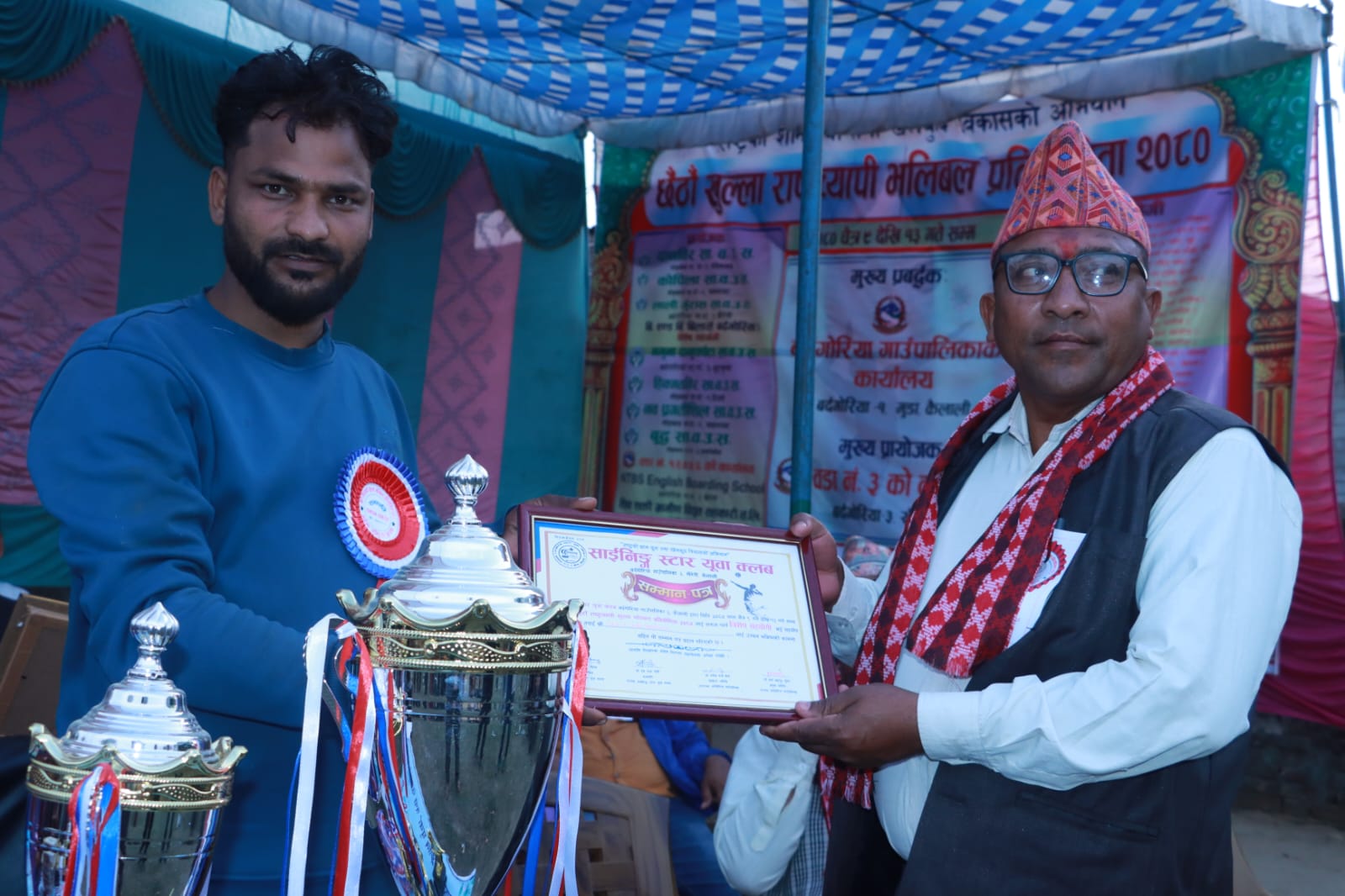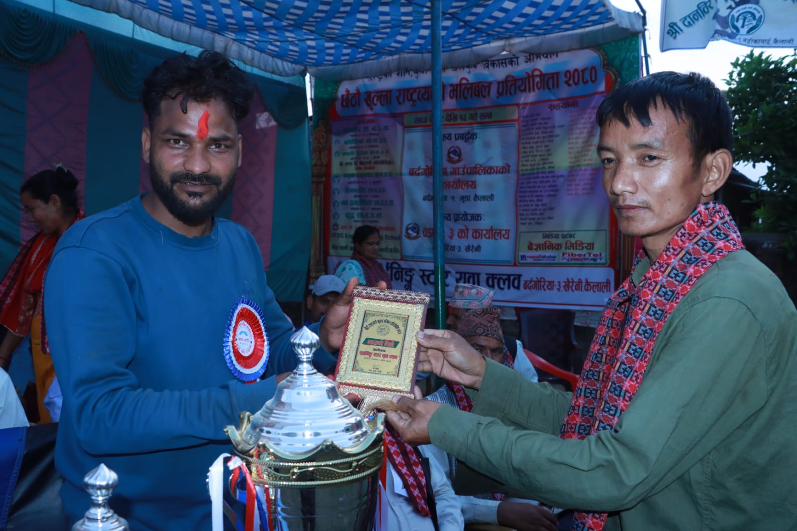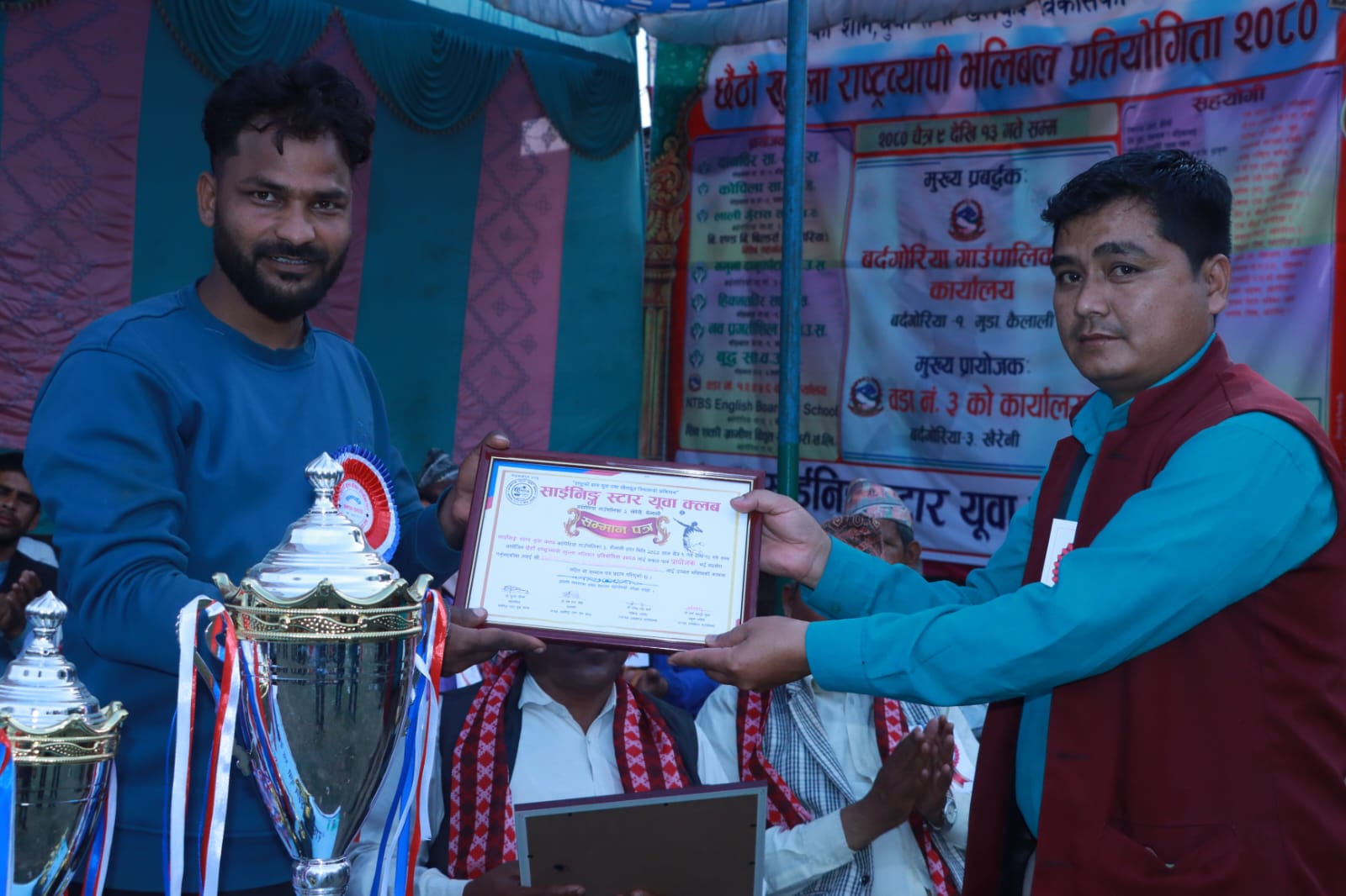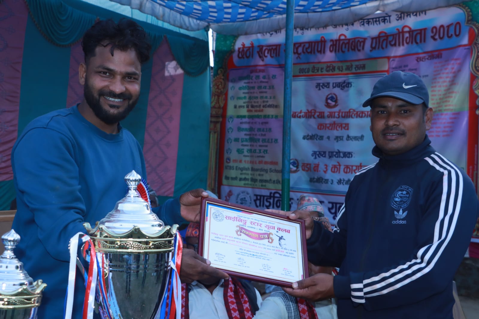 त्यस्तै, वेष्ट ब्लकर साईनिङ्ग स्टार ‘ए’ का खेलाडी विरेन्द्र विश्वकर्मा ‘वुलेट’, वेष्ट सेटरतर्फ केदार टूर एण्ड ट्राभल्सका आशिष र वेष्ट प्लेयरतर्फ आयोजक साईनिङ्ग स्टार ‘ए’ का बलदेव धामीलाई नगद पुरस्कारबाट सम्मानित गरिएको छ ।