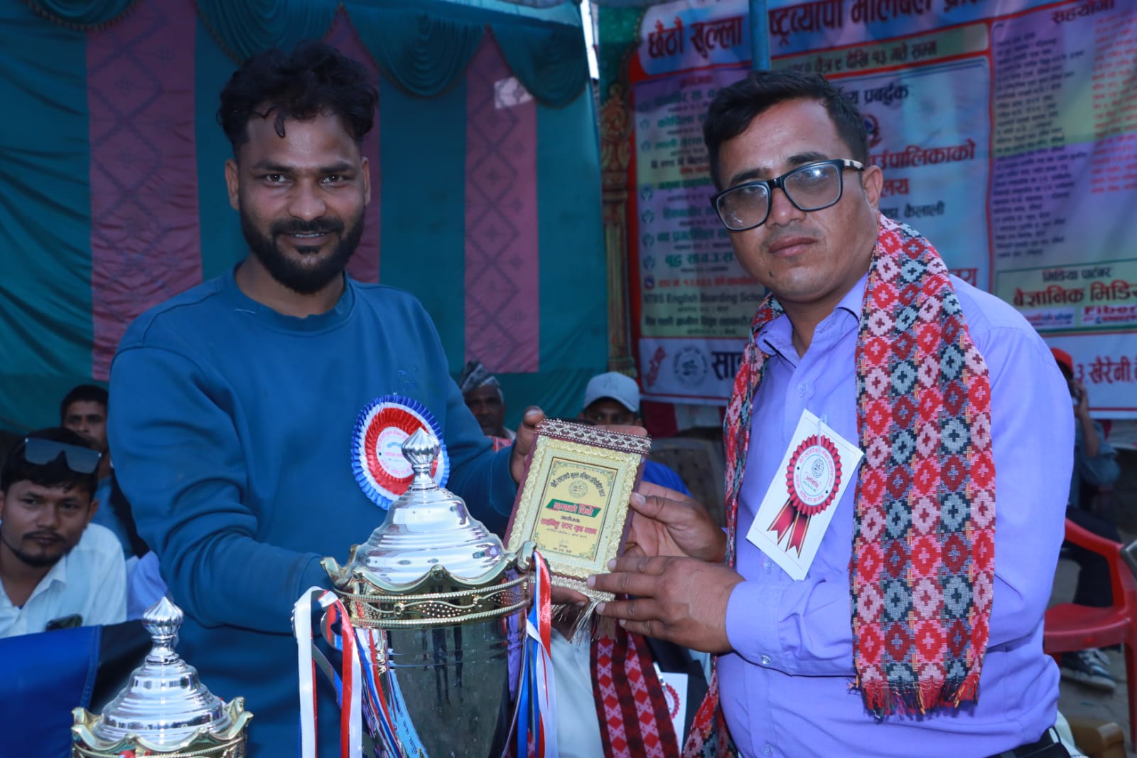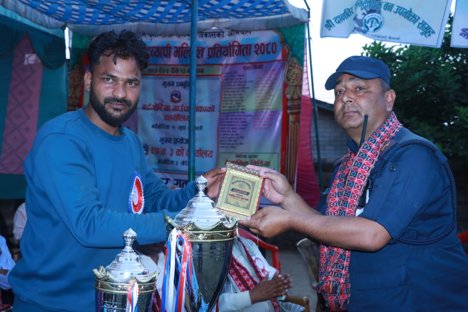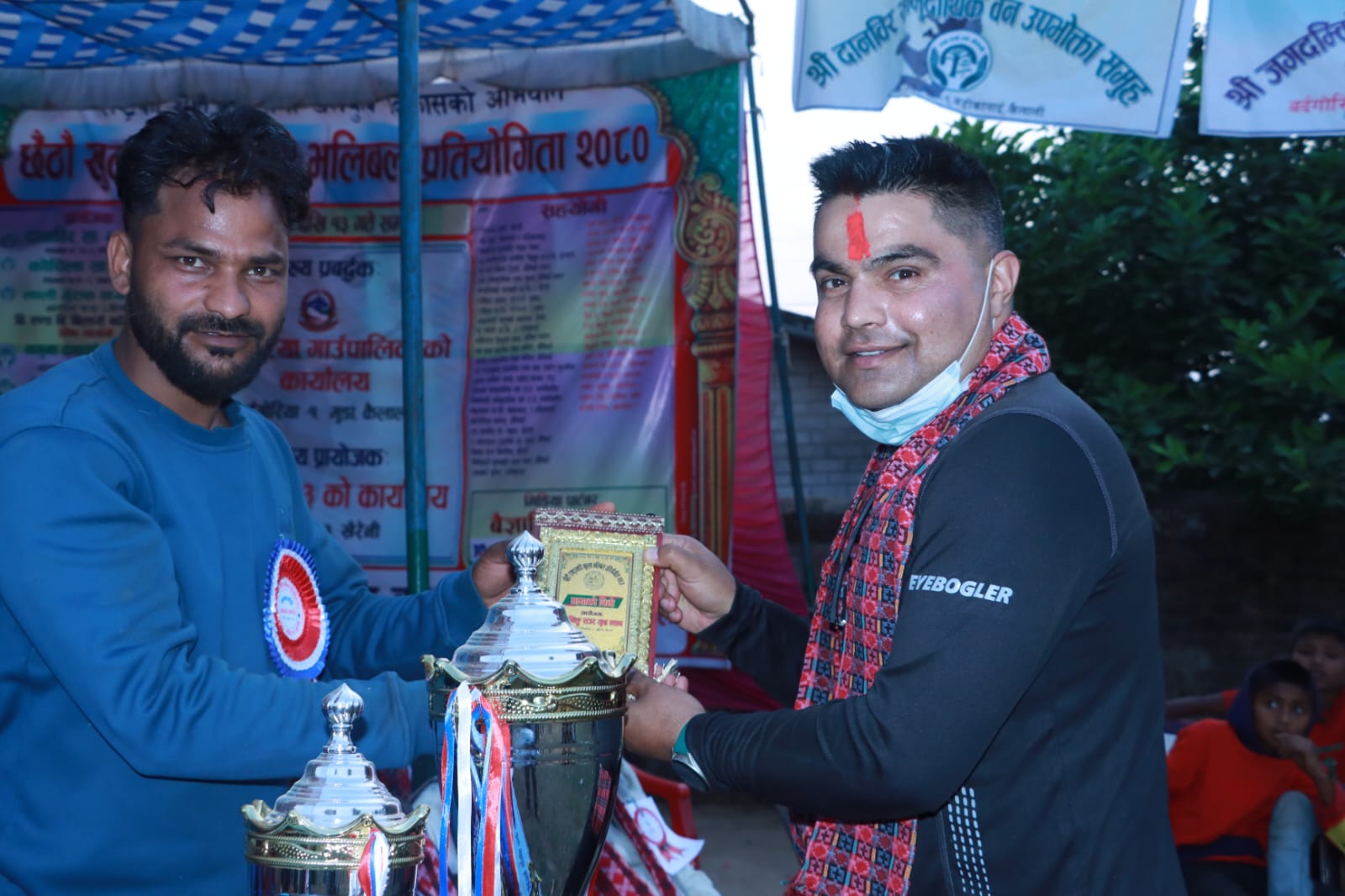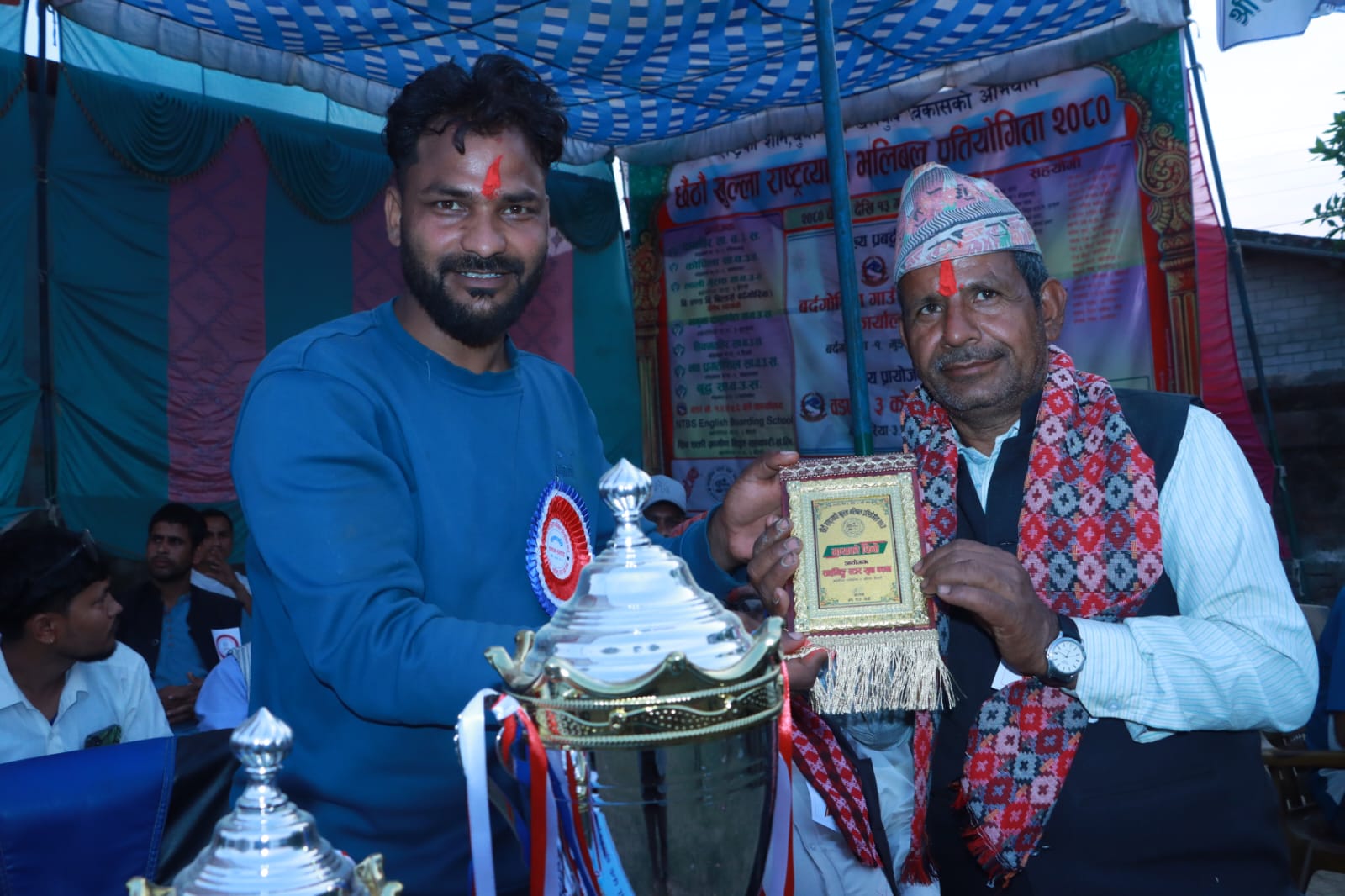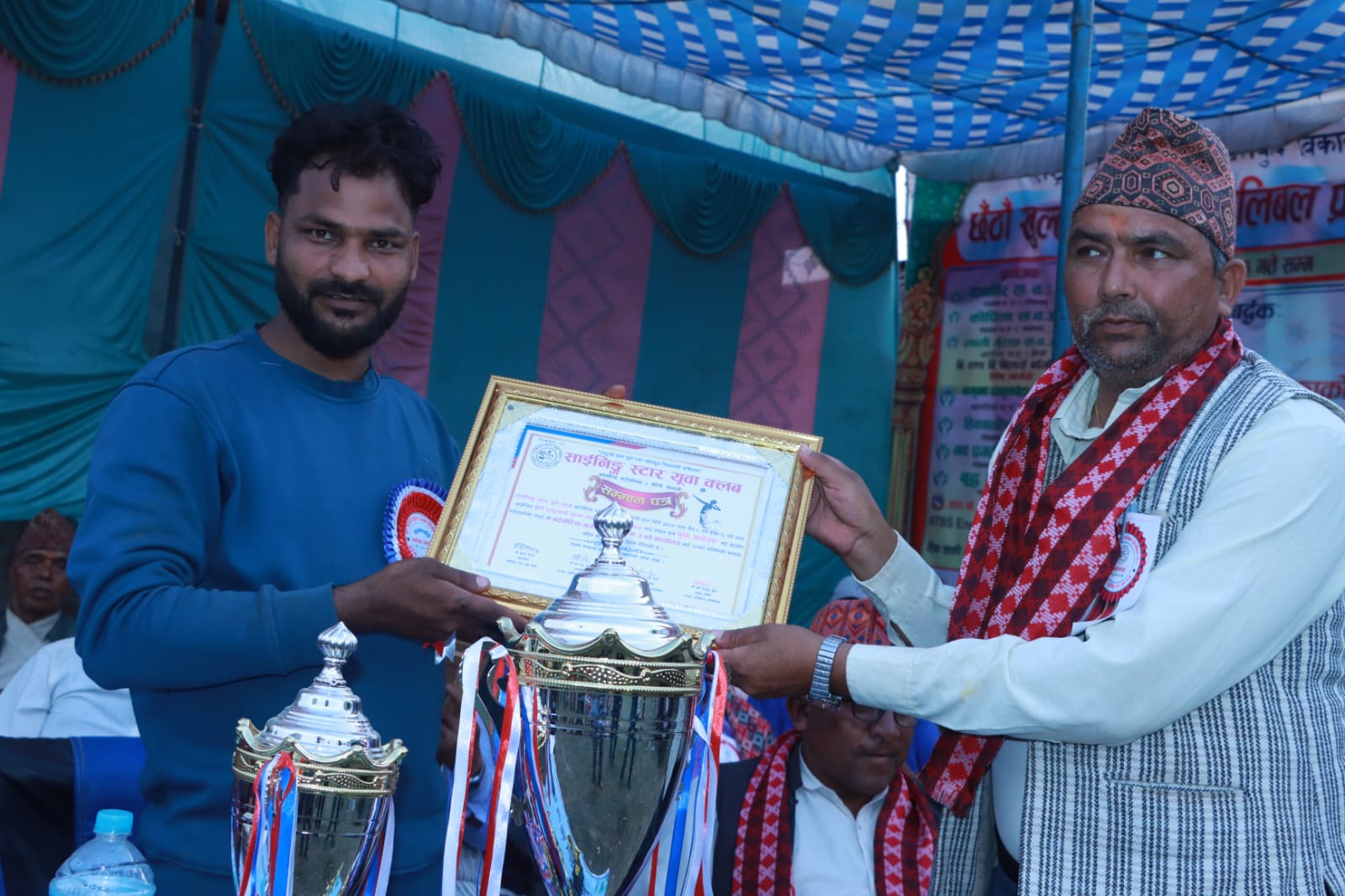त्यस्तै, वेष्ट ब्लकर साईनिङ्ग स्टार ‘ए’ का खेलाडी विरेन्द्र विश्वकर्मा ‘वुलेट’, वेष्ट सेटरतर्फ केदार टूर एण्ड ट्राभल्सका आशिष र वेष्ट प्लेयरतर्फ आयोजक साईनिङ्ग स्टार ‘ए’ का बलदेव धामीलाई नगद पुरस्कारबाट सम्मानित गरिएको छ ।