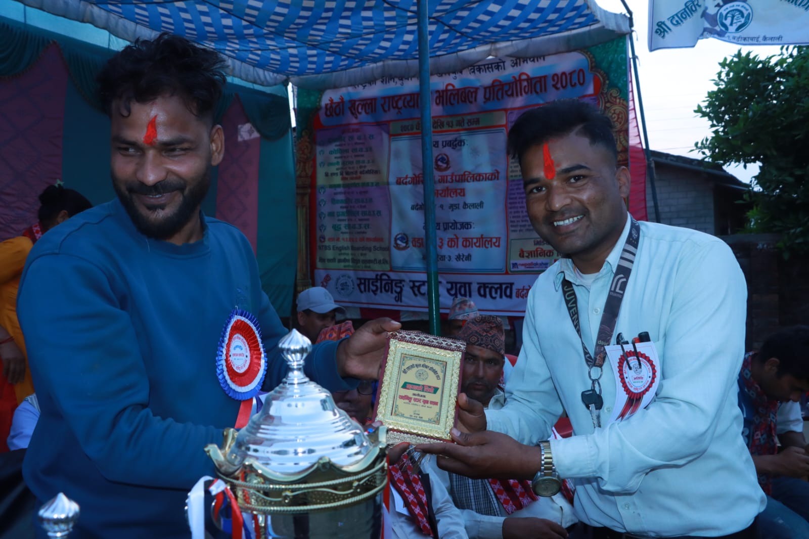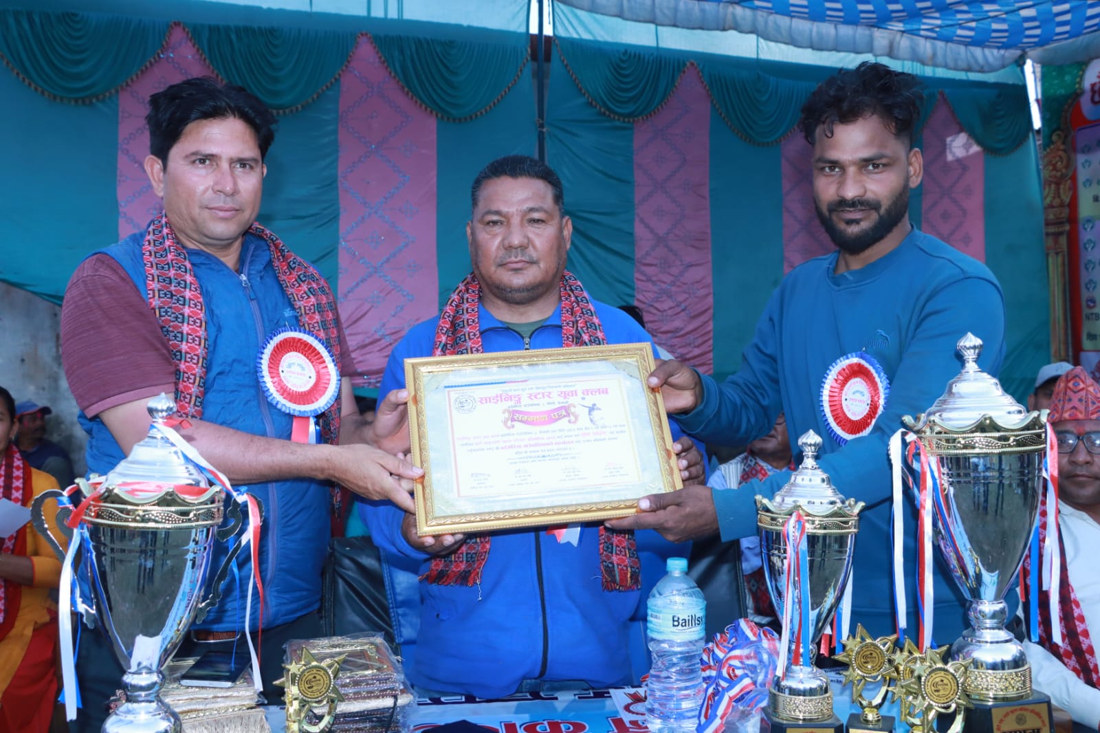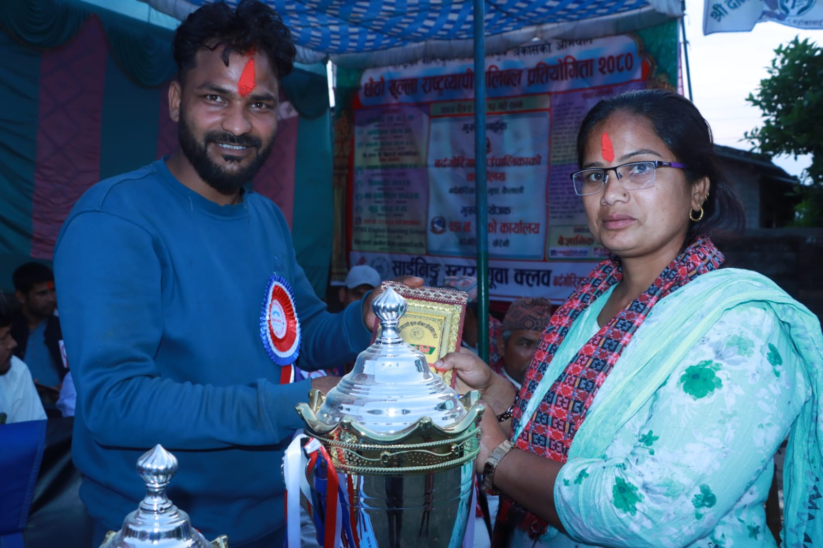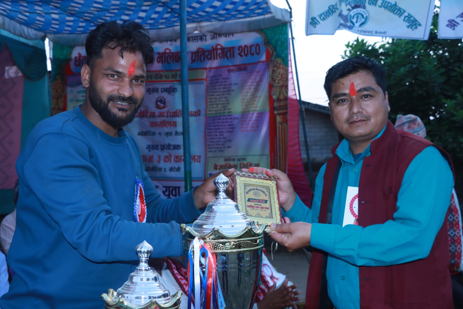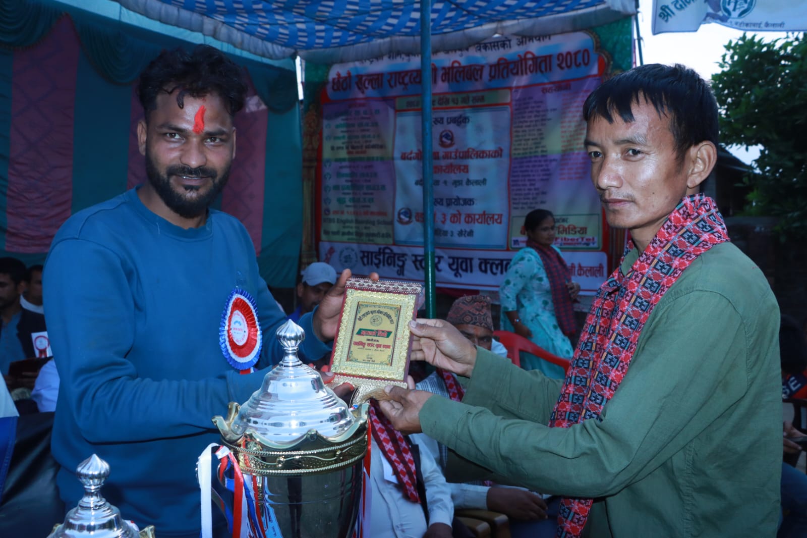 त्यस्तै, वेष्ट ब्लकर साईनिङ्ग स्टार ‘ए’ का खेलाडी विरेन्द्र विश्वकर्मा ‘वुलेट’, वेष्ट सेटरतर्फ केदार टूर एण्ड ट्राभल्सका आशिष र वेष्ट प्लेयरतर्फ आयोजक साईनिङ्ग स्टार ‘ए’ का बलदेव धामीलाई नगद पुरस्कारबाट सम्मानित गरिएको छ ।