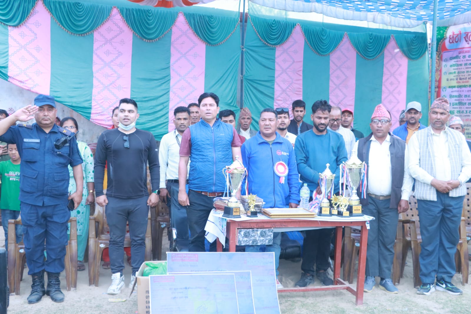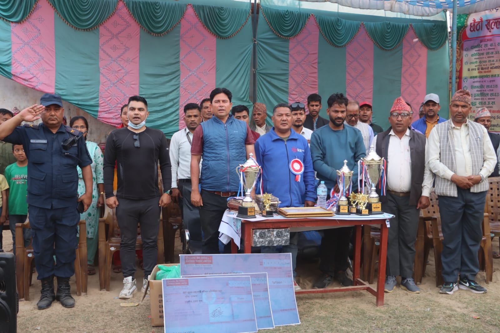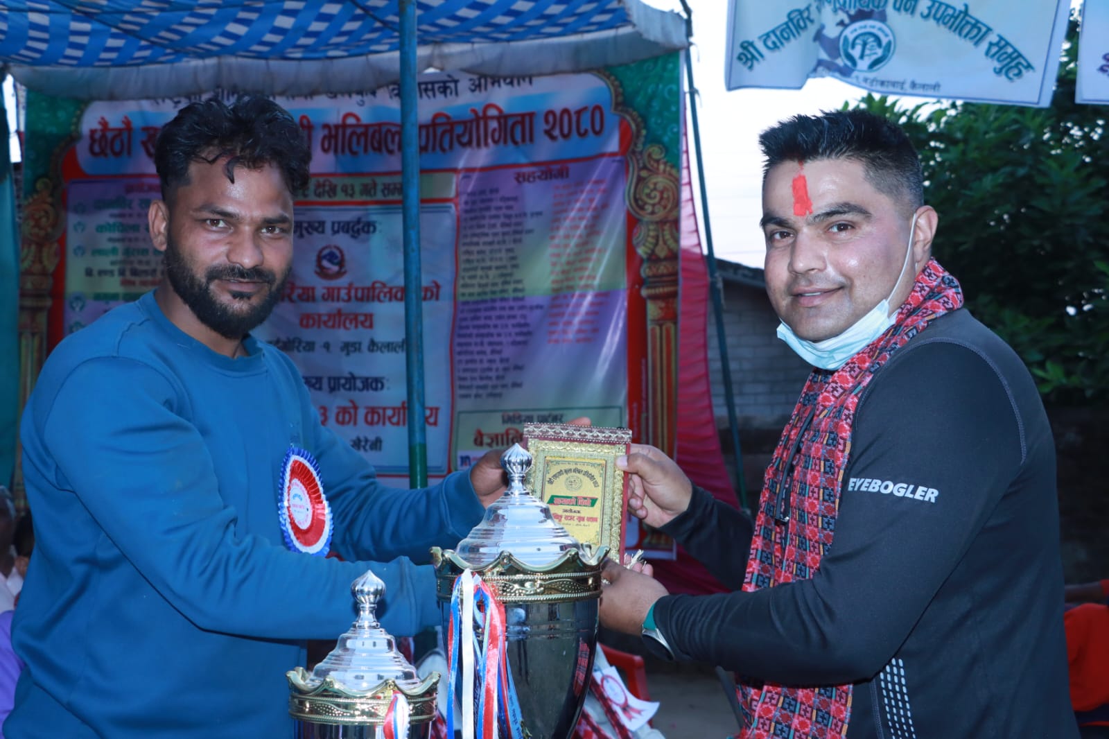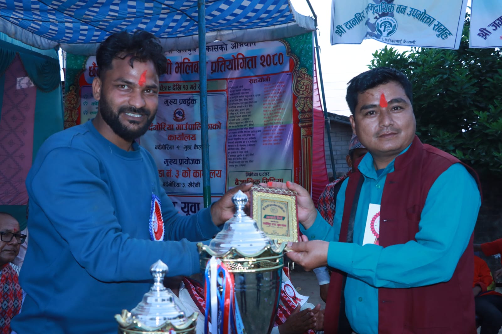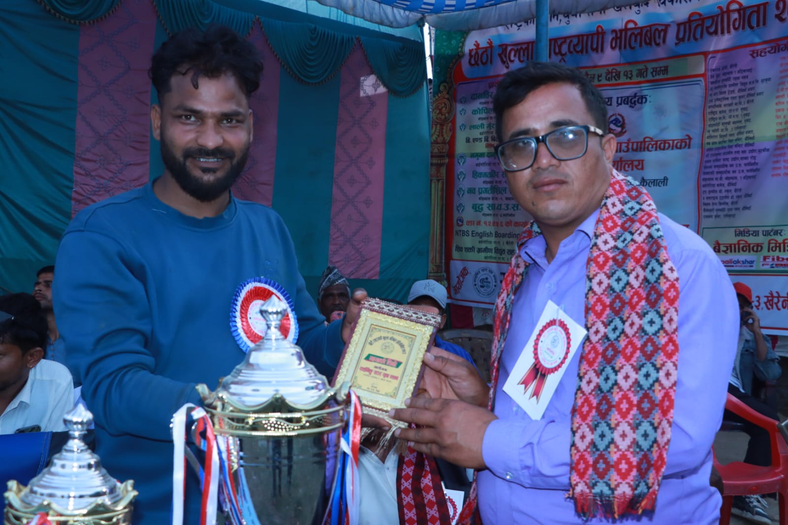 त्यस्तै, वेष्ट ब्लकर साईनिङ्ग स्टार ‘ए’ का खेलाडी विरेन्द्र विश्वकर्मा ‘वुलेट’, वेष्ट सेटरतर्फ केदार टूर एण्ड ट्राभल्सका आशिष र वेष्ट प्लेयरतर्फ आयोजक साईनिङ्ग स्टार ‘ए’ का बलदेव धामीलाई नगद पुरस्कारबाट सम्मानित गरिएको छ ।