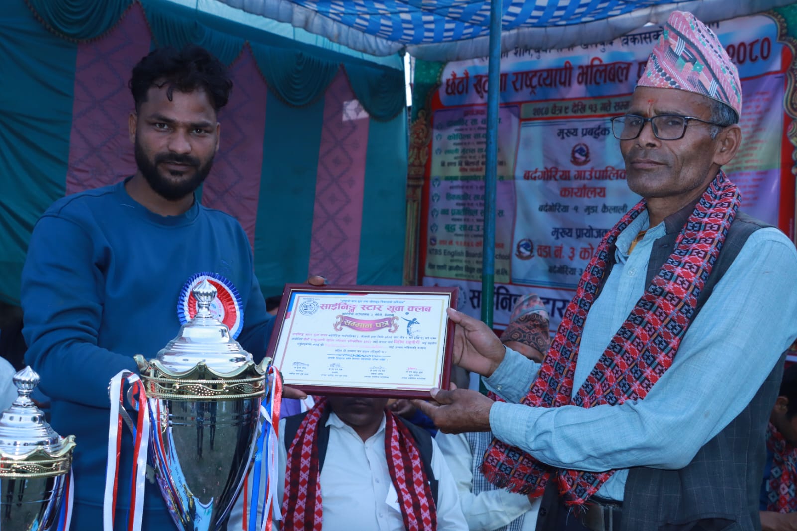 कैलाली । कैलालीको बर्दगोरियामा जारी छैटौं संस्करणको राष्ट्रव्यापी खुल्ला भलिबल प्रतियोगिताको उपाधि आयोजक साईनिङ्ग स्टार युवा क्लबले जितेको छ ।
