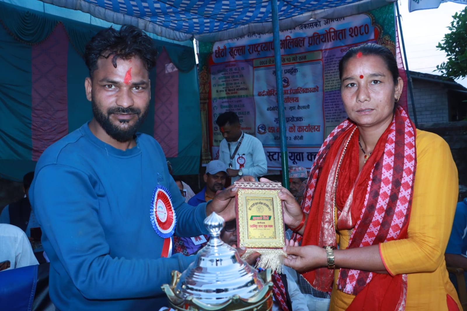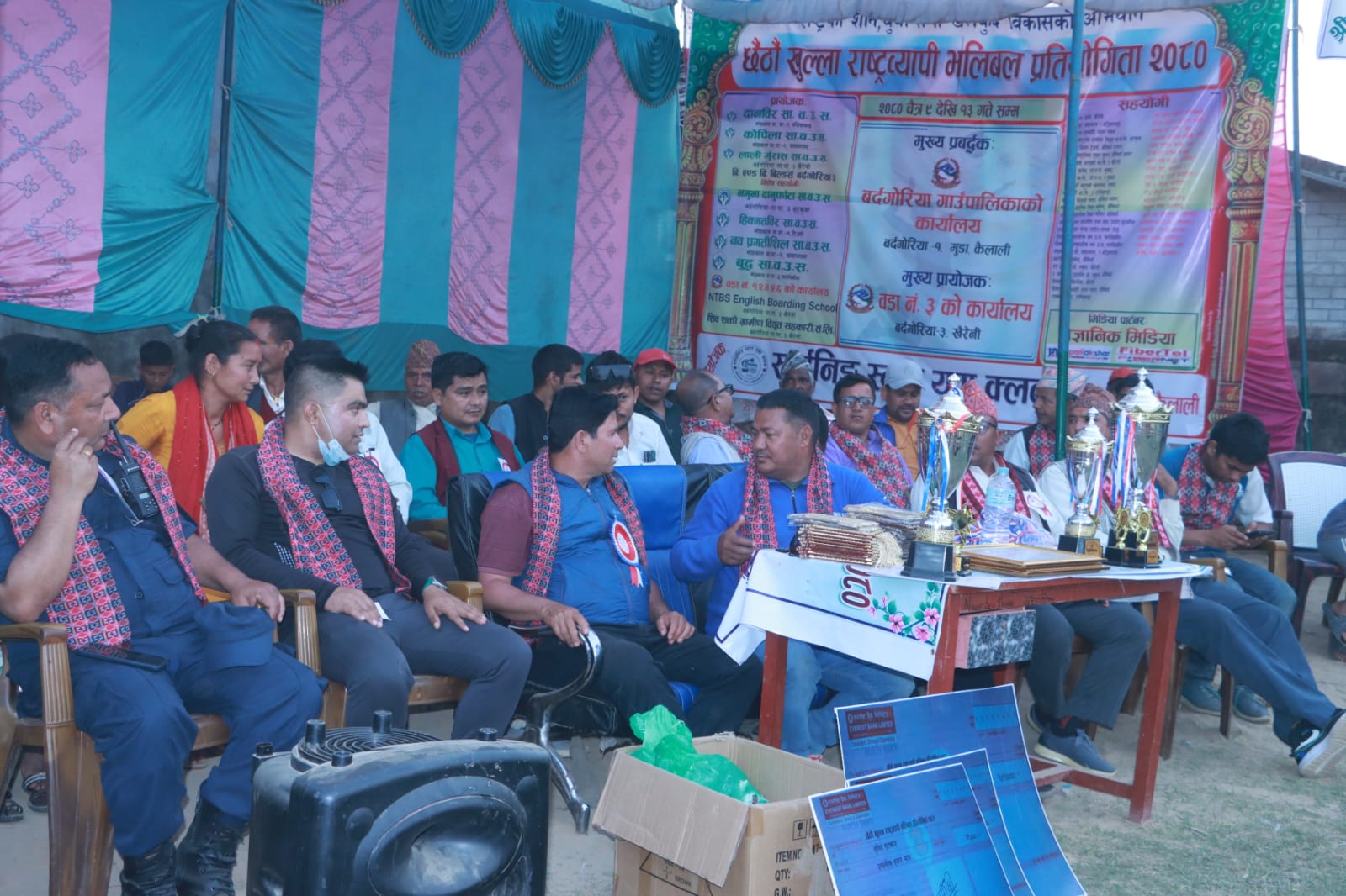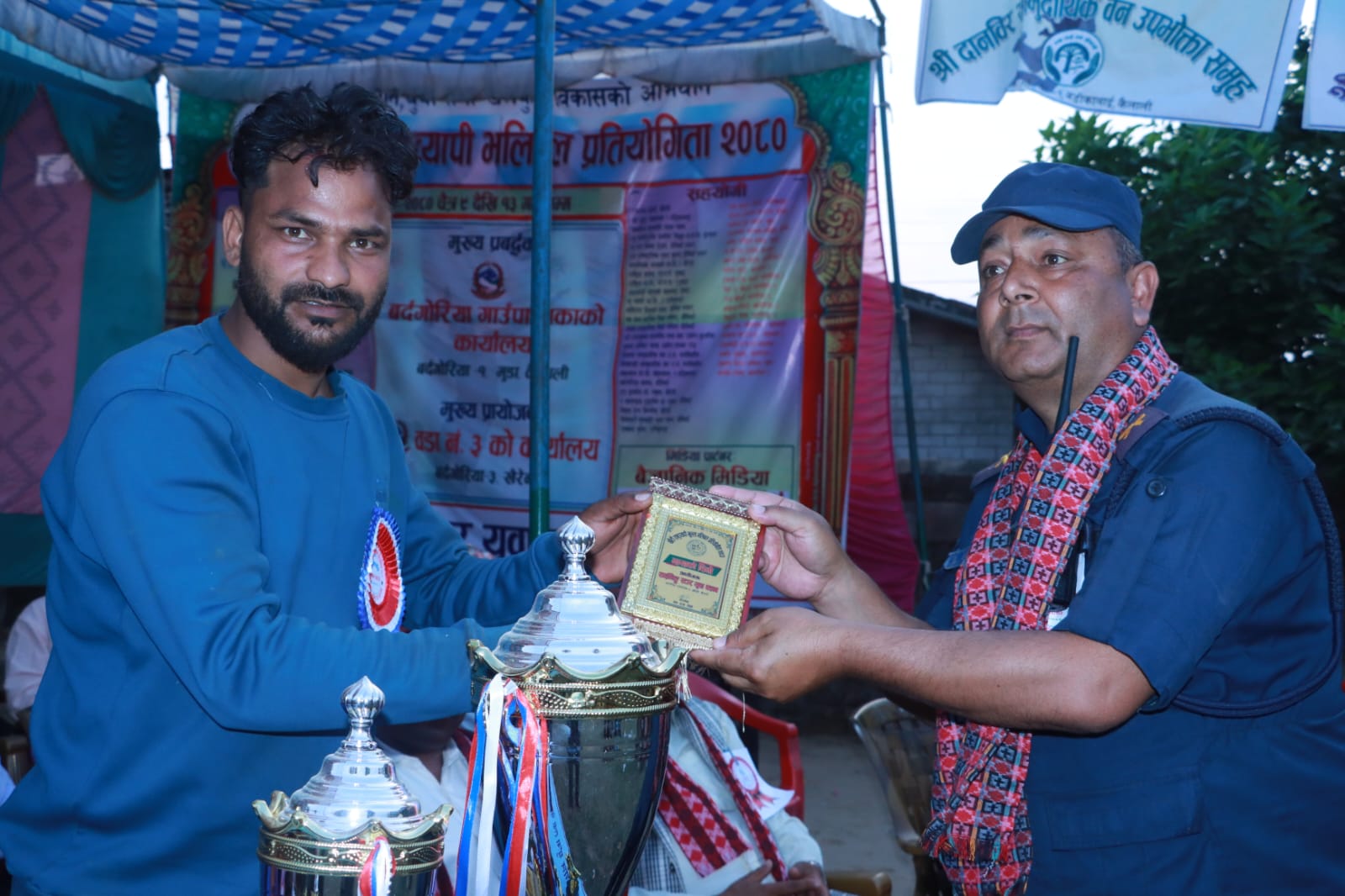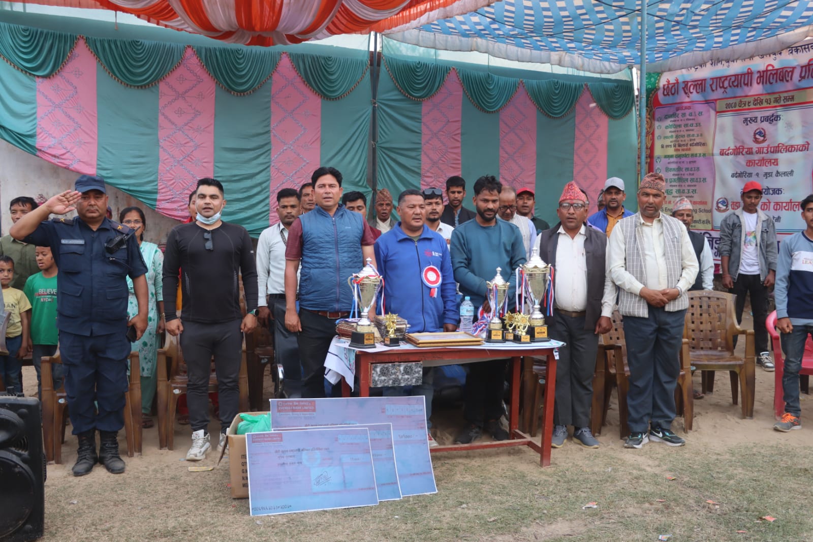 विजयी खेलाडी र टिमलाई बर्दगोरिया गाउँपालिकाका अध्यक्ष कर्णबहादुर कुँवर, उपाध्यक्ष लालदीप गिरी, वडा नम्बर ३ का वडाध्यक्ष मनऋषि आचार्य, वडा नम्बर २ का वडाध्यक्ष गोविन्द विक, न्यायिक समिति सदस्य बसन्तीदेवी साउँद, वडा सदस्य कपिल गुरुङ, भावनादेवी विक र मोहन्याल गाउँपालिका वडा नम्बर १ का वडाध्यक्ष प्रेमबहादुर बुढाले ट्रफी, मेडल तथा प्रमाणपत्रसहित पुरस्कार वितरण गरेका थिए ।