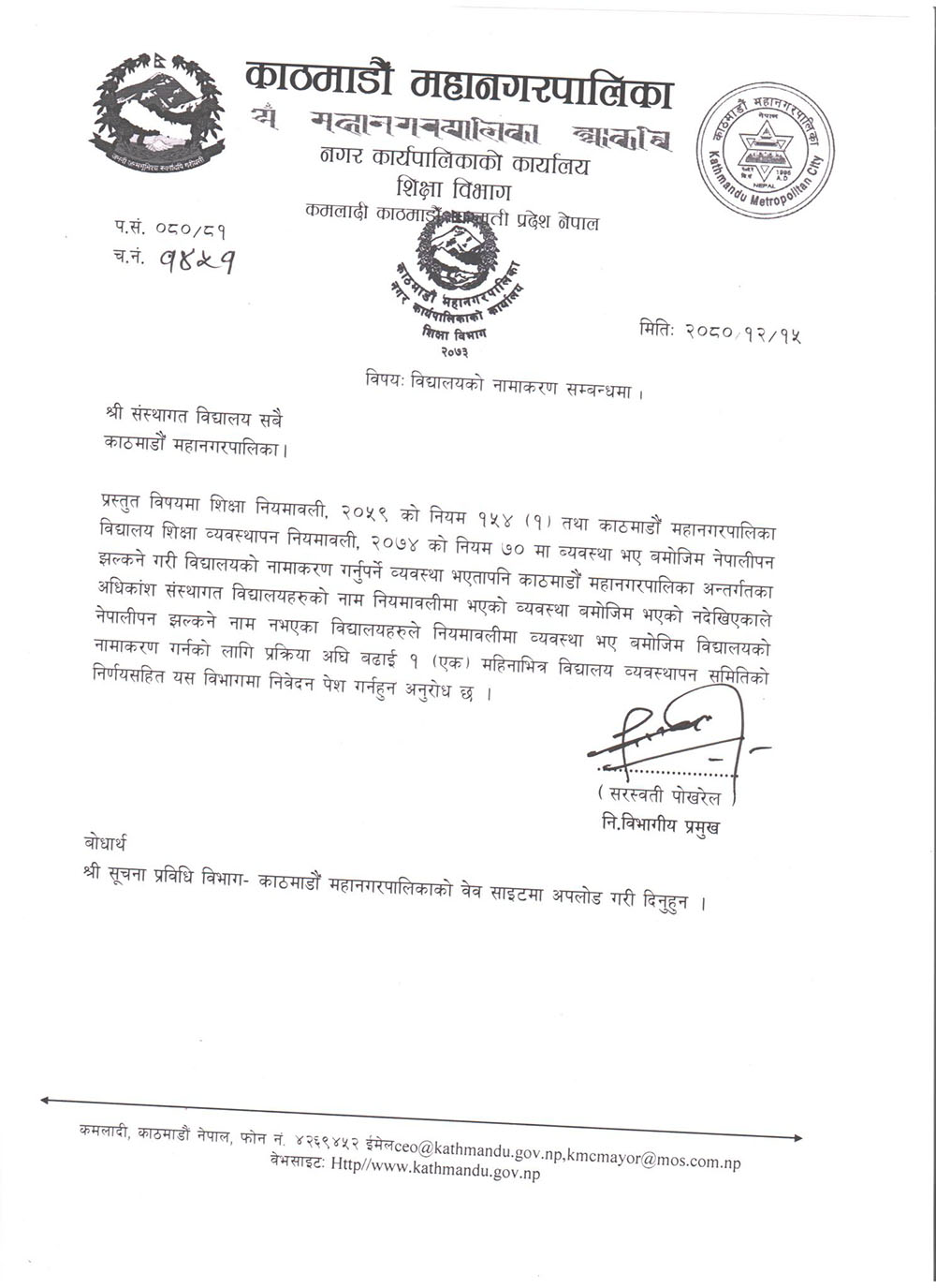 संस्थागत विद्यालयलाई नेपालीपन झल्कने नाम राख्न काठमाडौँ महानगरको निर्देशन