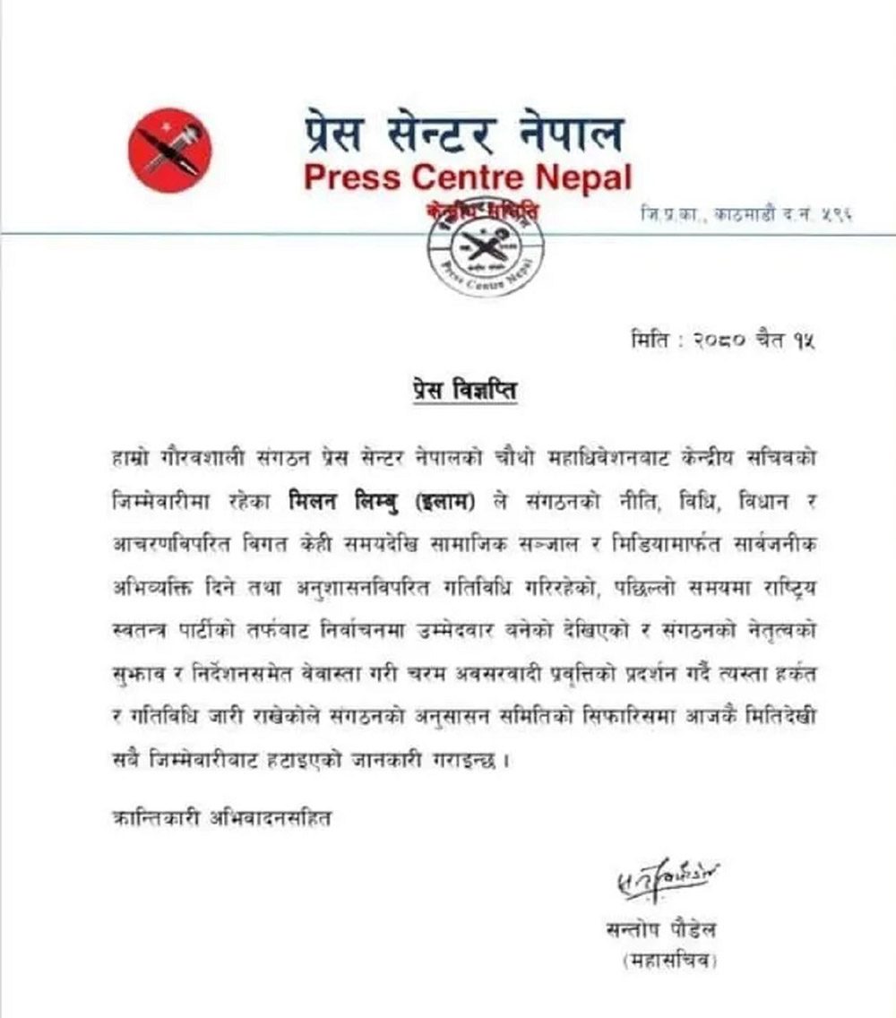 काठमाडौँ । वैशाख १५ गते हुने उपनिर्वाचनमा इलाम- २ बाट राष्ट्रिय स्वतन्त्र पार्टीबाट उम्मेदवार बनेका मिलन लिम्बूलाई नेकपा माओवादी केन्द्रनिकट प्रेस सेन्टरले बर्खास्त गरेको छ ।माओवादी केन्द्रमा आवद्ध लिम्बुलाई रास्वपाले इलाम- २ बात उम्मेदार बनाउने निर्णय गरिसकेको छ । लिम्बुलाई रास्वपाले उम्मेदवार बनाएसँगै प्रेस सेन्टरले विज्ञप्ति निकालेर बर्खास्त गरिएको जानकारी दिएको छ ।