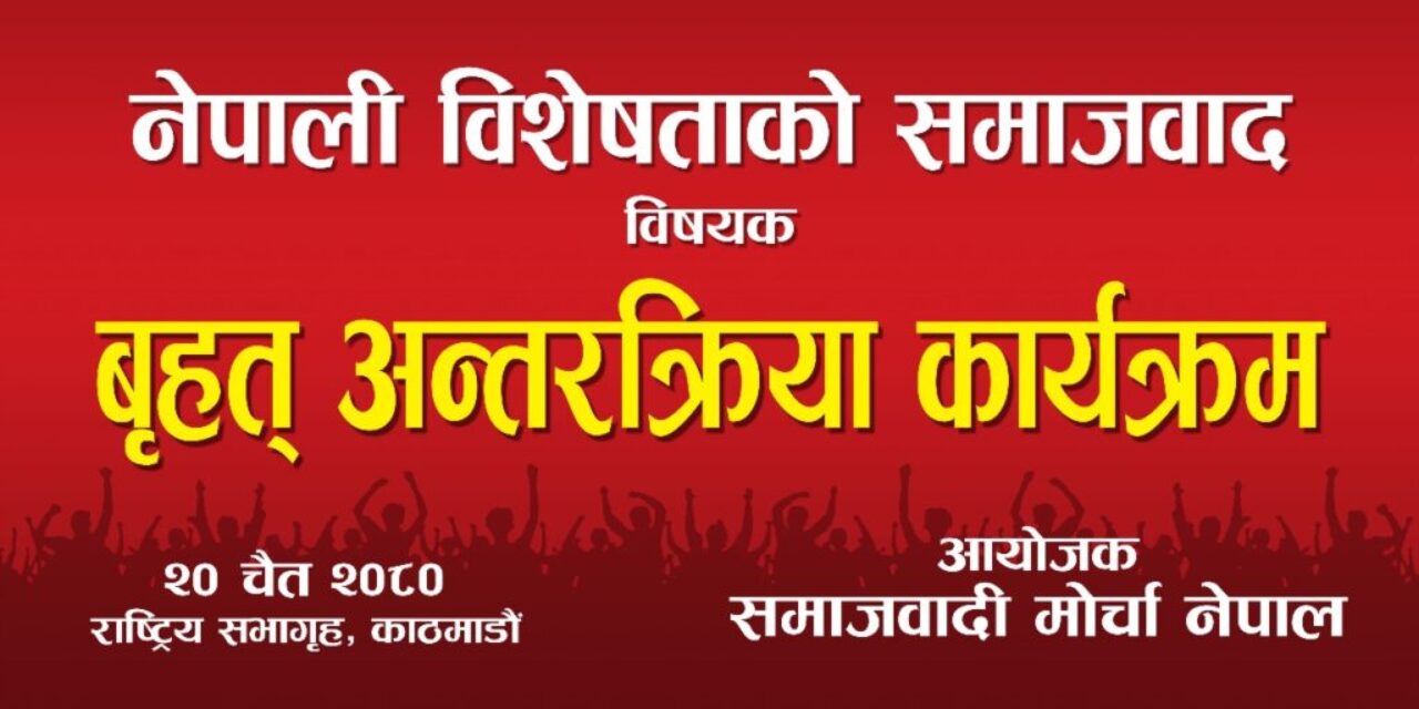 काठमाडौं । समाजवादी मोर्चाले आज वृहत् अन्तरक्रिया कार्यक्रम गर्दैछ ।राष्ट्रिय सभागृहमा कार्यक्रम मङ्गलवार दिउँसो १ बजे सुरु हुनेछ।समाजवादी मोर्चाले ‘नेपाली विशेषताको समाजवाद निर्माणबारे’ शिर्षकमा वृहत् अन्तरक्रिया कार्यक्रममा गर्न लागेको हो। समाजवादी मोर्चाको सचिवालयको बैठकको निर्णय अनुमोदन भएसँगै सो कार्यक्रम टुंगो लागेको नेकपा प्रवक्ता खडगबहादुर विश्वकर्माले जानकारी दिए ।सो मोर्चामा नेकपा माओवादी केन्द्र, नेकपा एकीकृत समाजवादी, जनता समाजवादी पार्टी नेपाल र नेत्रबिक्रम चन्द विप्लव नेतृत्वको नेकपा सहभागी रहेका छन्।