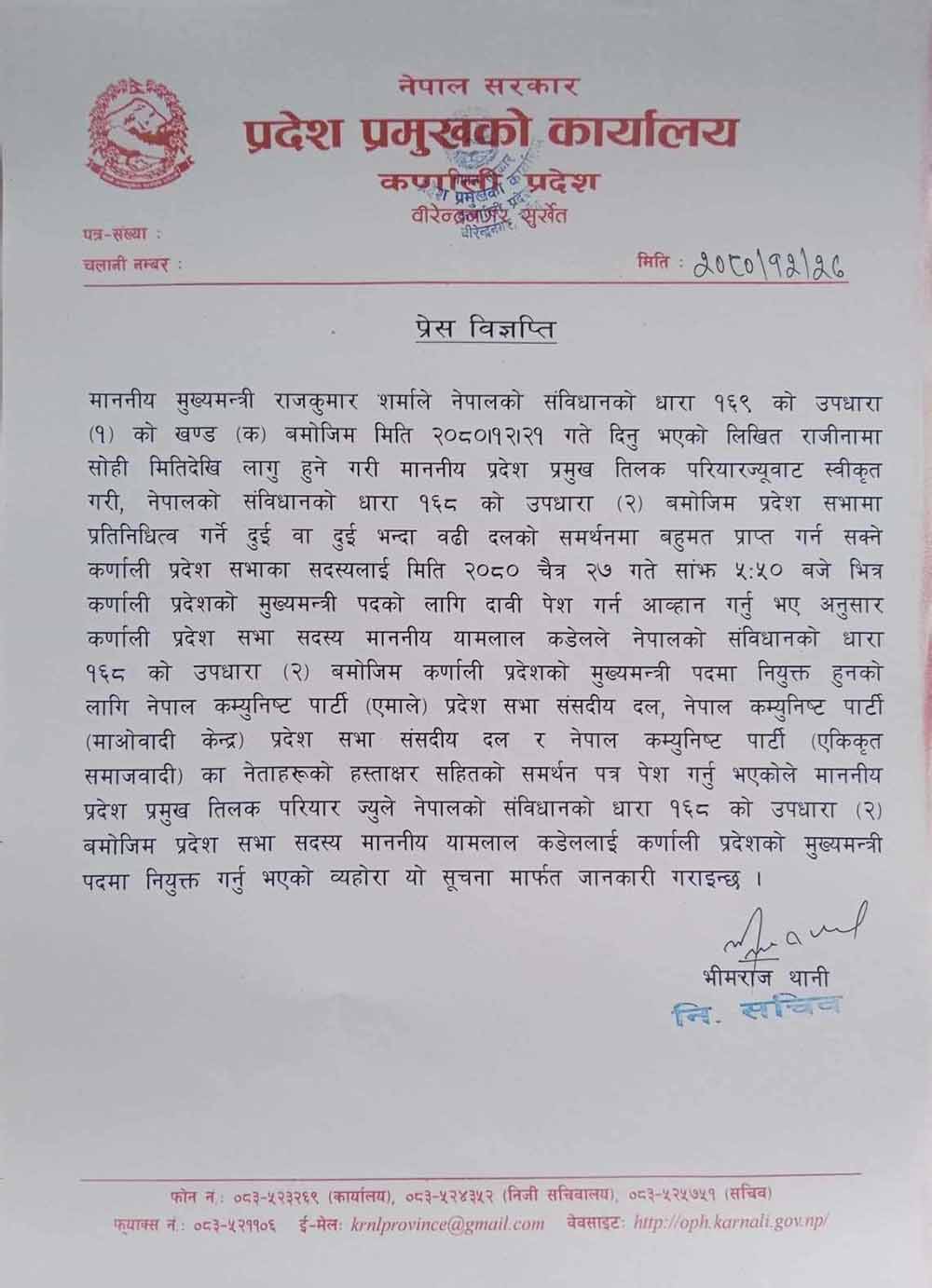 यस अघि आजै नेकपा एमाले, माओवादी केन्द्र र एकीकृत समाजवादीका २३ सांसदको हस्ताक्षरसहित नयाँ सरकार गठनका लागि प्रदेश प्रमुख तिलक परियारसमक्ष दाबी पेस गरिएको थियो ।