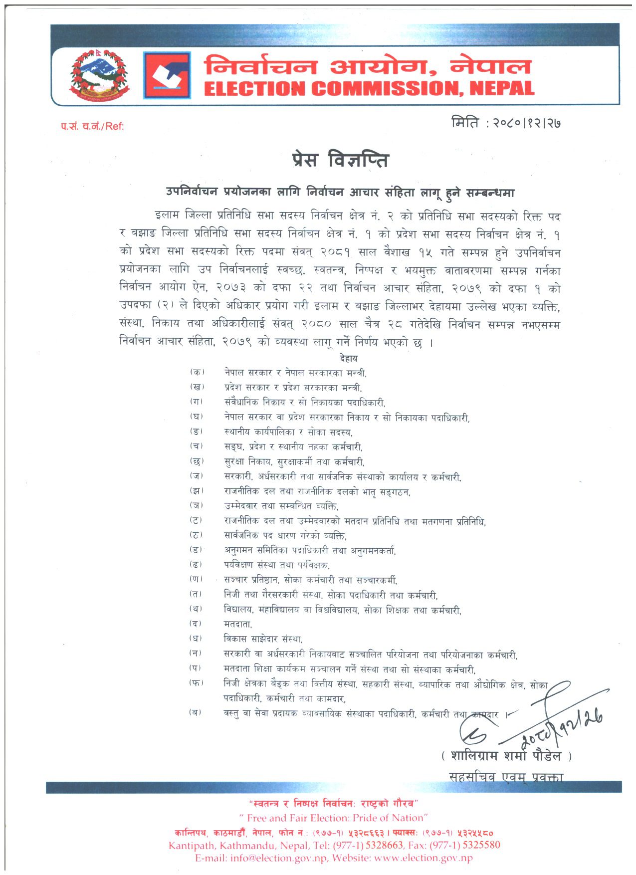 निर्वाचन आयोग ऐन, २०७३ को दफा २२ तथा निर्वाचन आचार संहिता, २०७९ को दफा एकको उपदफा दुईले दिएको अधिकार प्रयोग गरी इलाम र बझाङ जिल्लाभरमा लागू हुने गरी बुधबारदेखि निर्वाचन सम्पन्न नभएसम्म निर्वाचन आचार संहिता, २०७९ को व्यवस्था लागू गर्ने निर्णय भएको आयोगका सहसचिव एवम प्रवक्ता शालिग्राम पौडेलले जानकारी दिए ।