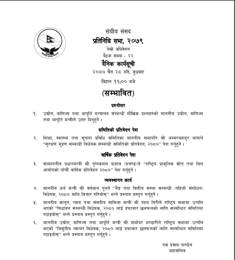 कानुन, न्याय तथा संसदीय मामिला मन्त्री पदम गिरीले राष्ट्रियसभामा उत्पत्ति भएको ‘विधायन सम्बन्धी विधेयक, २०८० लाई दफावार छलफलको लागि सम्बन्धित समितिमा पठाइयोस्’ भन्ने प्रस्ताव प्रस्तुत गर्ने र उद्योग, वाणिज्य तथा आपूर्तिमन्त्री दामोदर भण्डारीले राष्ट्रियसभामा उत्पत्ति भएको ‘विद्युतीय व्यापार विधेयक, २०८० लाई दफावार छलफलको लागि सम्बन्धित समितिमा पठाइयोस्’ भन्ने प्रस्ताव प्रस्तुत गर्ने सम्भावित कार्यसूची रहेको संसद् सचिवालयले जनाएको छ ।