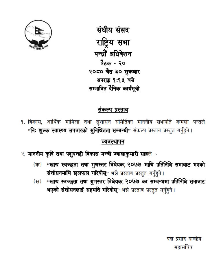 काठमाडौं। राष्ट्रियसभा बैठक बस्दैँछ । संघीय संसद भवन, नयाँ बानेश्वरमा उक्त बैठक बस्नेछ । बैठक दिउँसो १ः१५ बजे बोलाइएको छ। आजको बैठकमा विकास, आर्थिक मामिला तथा सुशाषन समितिका सभापति कमला पन्तले ‘निःशुल्क स्वास्थ्य उपचारको सुनिश्चितता सबन्धी’ संकल्प प्रस्ताव प्रस्तुत गर्नेछन् । कृषी तथा पशुपन्छी विकास मन्त्री ज्वालाकुमारी साहले ‘खाध्ध स्वच्छता तथा गुणस्तर बिधेयक २०७७ प्रतिनिधिसभावाट भएका संसोधन माथी छलफल गरियोस’ र सो ‘संसोधनलाइ सहमति गरियोस्’ भन्ने प्रस्ताव प्रस्तुत गर्ने महासचिव पदम प्रसाद पाण्डेले सार्बजनिक गरेको सम्भावित कार्यसुचीमा उल्लेख रहेको छ ।