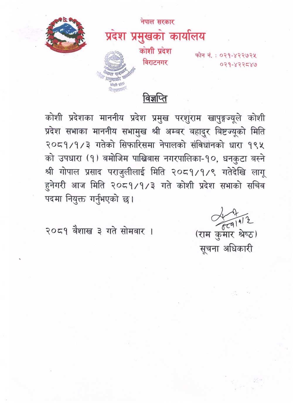 विराटनगर । कोशी प्रदेश सभाको सचिवमा गोपाल प्रसाद पराजुली पुन: नियुक्त भएका छन् । सोमबार प्रदेश प्रमुख परशुराम खापुङ्गले ९ वैशाखदेखि लागू हुने गरी पोखरेललाई नियुक्त गरेका हुन् ।कोशीका सभामुख अम्बरबहादुर विष्टले पोखरेललाई सचिवमा नियुक्त गर्न गरेको सिफारिस अनुसार प्रदेश प्रमुखले नियुक्त गरेका हुन् ।