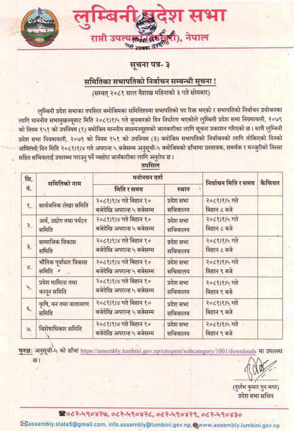 प्रदेश सभाका प्रदेश मामिला तथा कानुन समिति, सामाजिक विकास समिति, कृषि, वन तथा वातावरण समिति, भौतिक पूर्वाधार विकास समिति, अर्थ, उद्योग तथा पर्यटन समिति र सार्वजनिक लेखा समिति र विशेष अधिकार समितिको सभापति चयनका लागि मंगलबार ४ उम्मेदवारी दर्ता हुनेछ ।