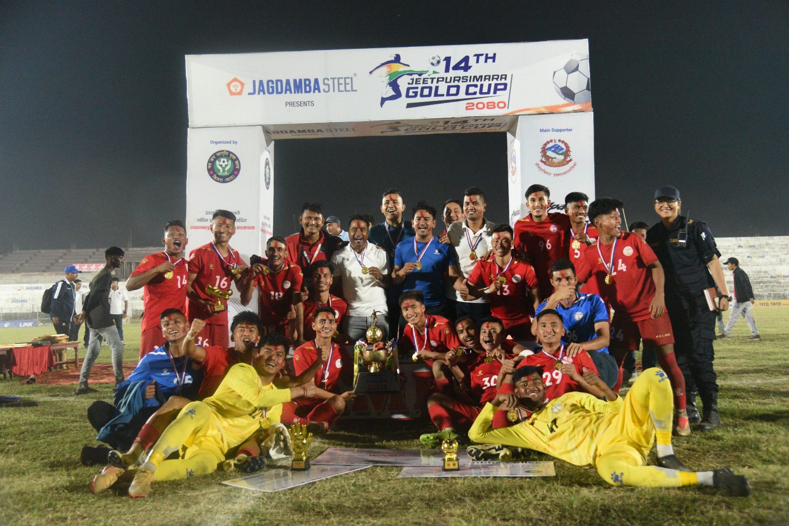 बारा । नेपाल पुलिस क्लबले जगदम्बा स्टिल १४ औं जीतपुरसिमरा गोल्डकपको उपाधि जितेको छ । सोमबार राती सिमरा रङ्गशालामा सम्पन्न प्रतिष्पर्धात्मक खेलमा मच्छिन्द्र फुटबल क्लबलाई टाइव्रेकरमा ४–३ ले हराउँदै पुलिसले पहिलो पटक जीतपुरसिमरा गोल्डकपको उपाधि जितेको हो । निर्धारित ९० मिनेट र अतिरिक्त समयको खेल गोल रहित बराबरीमा टुंगिएपछि भएको टाइव्रेकरमा पुलिसले जित निकालेको हो । प्रशिक्षक चेतन घिमिरेले टाइव्रेकरलाई लक्षित गरि अतिरिक्त समयको अन्तीममा मैदान पठाएका गोलरक्षक अमित टमाटा पुलिसको जितमा नायक बने । अमितले मच्छिन्द्रका दुई प्रहार रोकेपछि पुलिस उपाधि उचाल्न सपल भयो ।