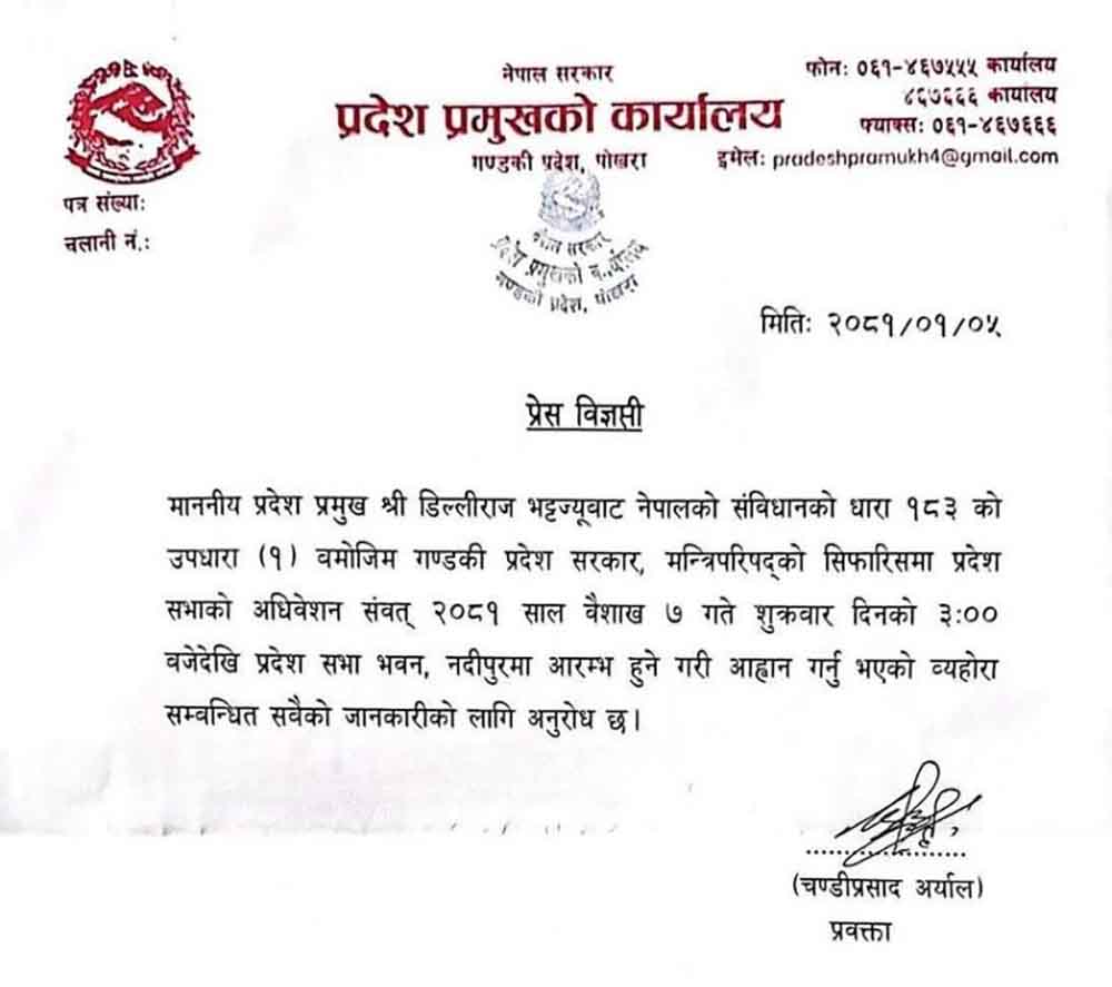पोखरा । गण्डकी प्रदेशसभाको अधिवेशन वैशाख ७ गतेका लागि आह्वान गरिएको छ । प्रदेश प्रमुख डिल्लीराज भट्टले ७ गते ३ बजेदेखि प्रदेश अधिवेशन आह्वान गरेका हुन् ।यस अधिवेशनमा मुख्यमन्त्री खगराज अधिकारीले विश्वासको मत लिने तयारी समेत गरेका छन् ।