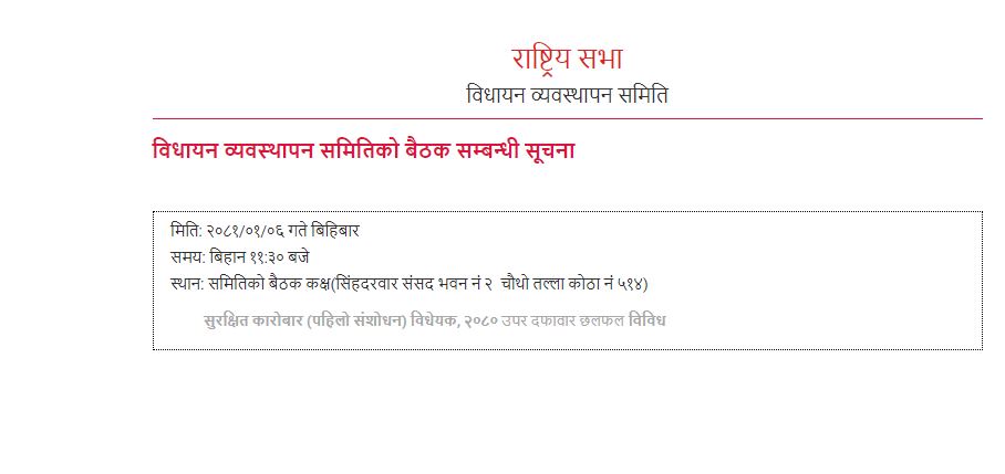 काठमाडौं । संघीय संसदको एक समितिको बैठक बस्दैँछ । राष्ट्रियसभा अन्तर्गतको राज्य व्यवस्था तथा सुशासन समितिको बैठक बस्न लागेको हो । बैठक बिहान ११ः३० बजे बोलाइएको छ ।संघीय संसद सचिवालयका अनुसार आजको बैठकमा सुरक्षित कारोबार (पहिलो संशोधन) विधेयक, २०८० उपर दफावार छलफल हुने कार्यसुचीमा उल्लेख गरिएको छ ।