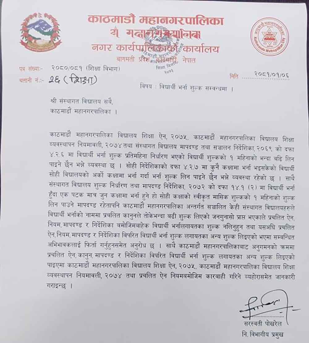 ‘संस्थागत विद्यालय शुल्क निर्धारण तथा मापदण्ड निर्देशिका, २०७२ को दफा १४।१ ९२० मा विद्यार्थी भर्ना हुँदा एक पटक मात्र जुन कक्षामा भर्ना हुने हो सोही कक्षाको स्वीकृत मासिक शुल्कको १ महिनाको शुल्क लिन पाउने मापदण्ड रहेतापनि काठमाडौँ महानगरपालिका अन्तर्गत सञ्चालित केही संस्थागत विद्यालयहरूले विद्यार्थी भर्नाको नाममा प्रचलित कानूनले तोकेभन्दा बढी शुल्क लिएको जनगुनासो प्राप्त भएकाले प्रचलित ऐन नियम, मापदण्ड र निर्देशिका बमोजिमबाहेक विद्यार्थी भर्नालगायतका शुल्क नलिनुहुन तथा यसअघि प्रचलित ऐन, नियम, मापदण्ड र निर्देशिका विपरीत विद्यार्थी भर्ना शुल्क लगायतका अन्य शुल्क लिइएको भएमा सम्बन्धित अभिभावकलाई फिर्ता गर्नुहुन समेत अनुरोध छ ।’