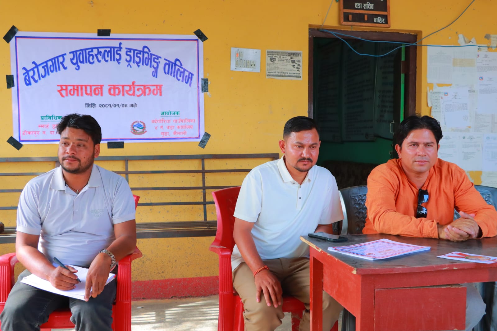 गाउँमै बसिरहेका युवा सहभागी रहेको समापन ड्राइभिङ तालिममा बर्दगोरिया गाउँपालिकाका उपाध्यक्ष गणेश राज गिरी (लालदीप) प्रमुख अतिथि रहनु भएको थियो। ड्राइभिङ तालिम लिएका कोही पनि युवा बेरोजगार भएर बस्नु नपरेको तथ्यलाई ध्यानमा राखेर ड्राइभिङ तालिम सुरु गरिएको वडाध्यक्ष वडा अध्यक्ष जगत बहादुर शाहीले बताए। वडा कार्यालयले चालु आर्थिक वर्षमा बिनियोजन गरेको २ लाखमा युवालाई मुडा बजार खेल मैदानमा भेला गरेर ड्राइभिङ तालिमको आयोजना गरिएको थियो।