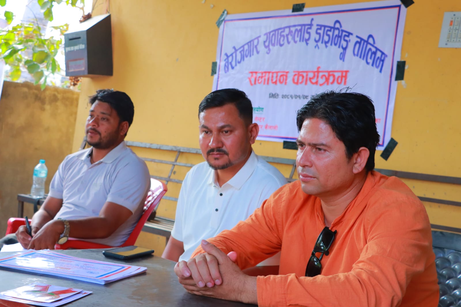 २० जनालाई लक्ष्यीत गरेर ड्राइभिङ तालिममा सहभागिता रहेको वडाध्यक्ष शाहीले बताए । वेरोजगारमा बसिरहेका युवालाई लक्ष्यीत गरेर आयोजना गरिएको ड्राइभिङ तालिममा वडा भरिका २० जना युवाको सहभागिता रहेको थियो । ‘रोजगारको कुरा गर्ने वित्तिकै सीपको कुरा आउँदो रहेछ ।