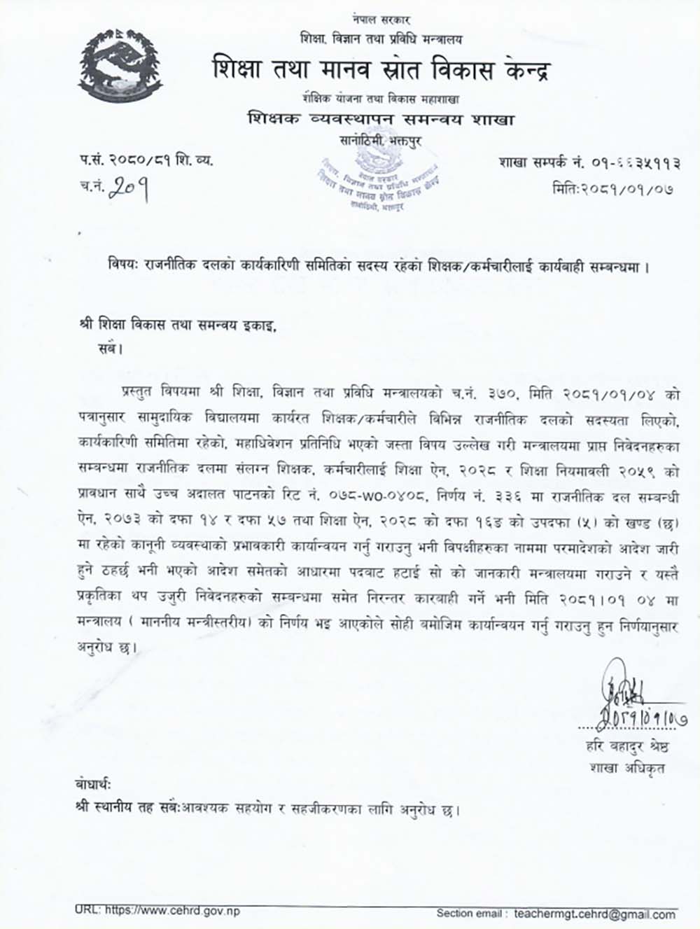 निर्देशनमा राजनीतिक दलमा संलग्न शिक्षक, कर्मचारीलाई शिक्षा ऐन, २०२८ र शिक्षा नियमावली २०५९ को प्रावधान साथै उच्च अदालत पाटनको रिट नं. ०७८–०४०८, निर्णय नं. ३३६ मा राजनीतिक दल सम्बन्धी ऐन, २०७३ को दफा १४ र दफा ५७ तथा शिक्षा ऐन, २०२८ को दफा १६ (ङ) को उपदफा (५) को खण्ड (छ) मा रहेको कानुनी व्यवस्थाको प्रभावकारी कार्यान्वयन गर्नु गराउनु शिक्षा मन्त्रालयको नाममा परमादेश जारी गरेको समेत उल्लेख गरिएको छ ।