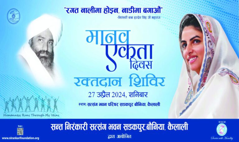 कैलाली । “रगत नालीमा होइन, नाडीमा बगाऔं’ सत्गुरु बाबा हरदेवसिंह जी महाराजको भनाइलाई स्मरण गर्दै देशव्यापी रुपमा मानव एकता दिवस मनाइएको छ । सन्त निरंकारी मण्डल शाखा बौनियाले शनिबार एक विशेष कार्यक्रमको आयोजना गरी मानव एकता दिवस मनाएको हो ।