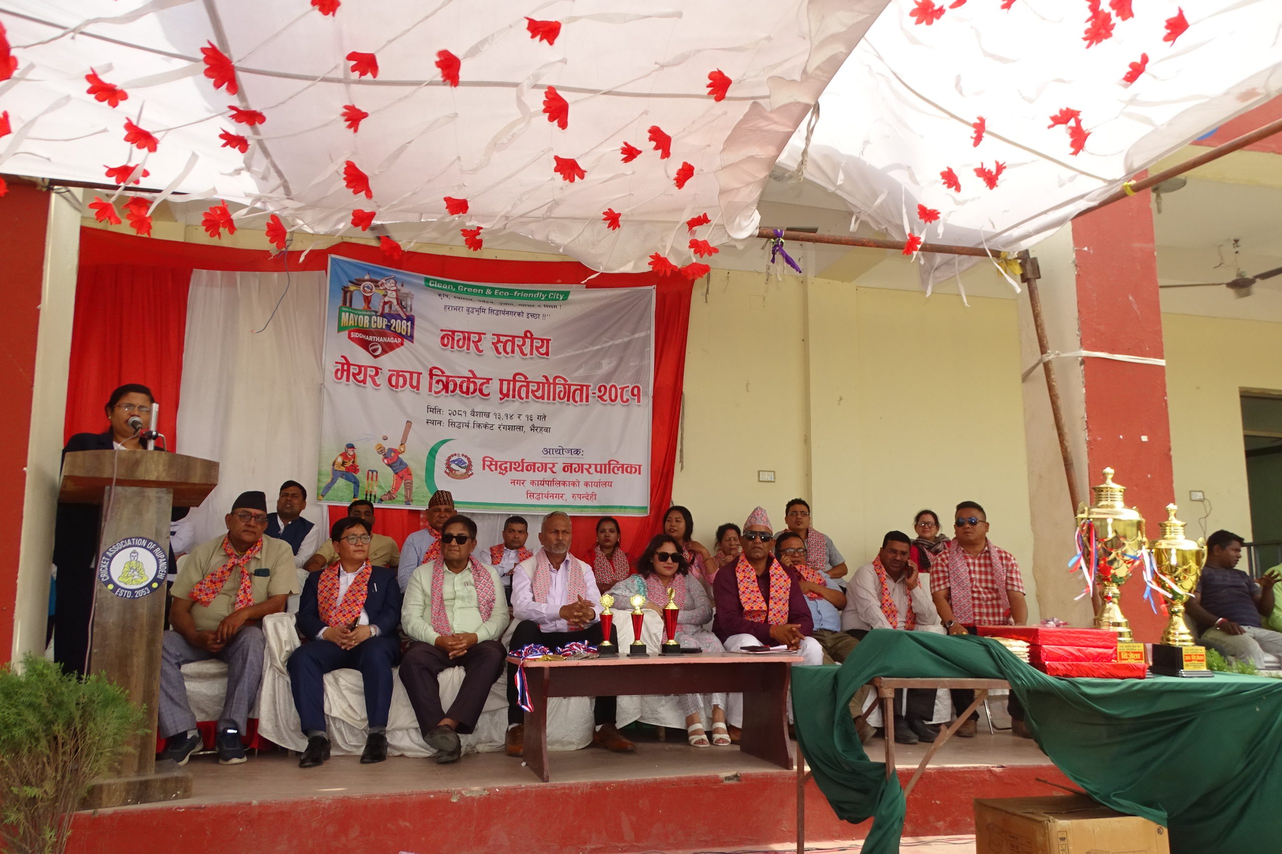 भैरहवा। सिद्धार्थनगर मेयर कप क्रिकेट प्रतियोगिताको उापधि वडा नम्बर ३ ले जितेको छ। सिद्धार्थनगर नगरपालिकाको आयोजनामा भैरहवामा सम्पन्न नगरस्तरीय मेयर कप क्रिकेट प्रतियोगितामा वडा नम्बर १ को टिमलाई पराजित गर्दै वडा नम्बर ३ ले उपाधि जितेको हो। भैरहवास्थित सिद्धार्थ रंगशालामा आइतबार भएको फाइनल खेलमा वडा नम्बर ३ ले वडा नम्बर १ लाई ६ विकेट पराजित गर्दै उपाधि चुम्न सफल भएको छ।