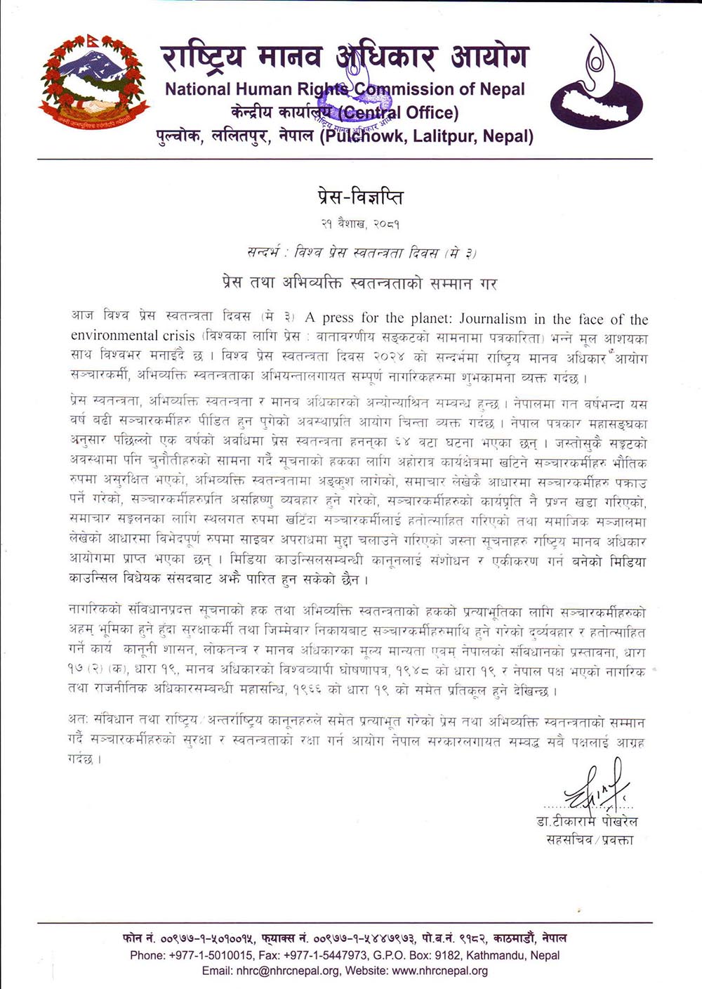 आयोगका प्रवक्ता डा. टीकाराम पोखरेलले विश्व प्रेस स्वतन्त्रता दिवसका अवसरमा विज्ञप्ति जारी गर्दै सुरक्षाकर्मी तथा जिम्मेवार निकायबाट हुने दुर्व्यवहार र हतोत्साहित गर्ने कार्य कानुनी शासन, लोकतन्त्र र मानव अधिकारका मूल्य मान्यताविपरीत रहेको उल्लेख छ ।उनले एक वर्षको अवधिमा प्रेस स्वतन्त्रता हननका ६४ वटा घटना भएको भन्दै चिन्ता व्यक्त गरेका छन् ।