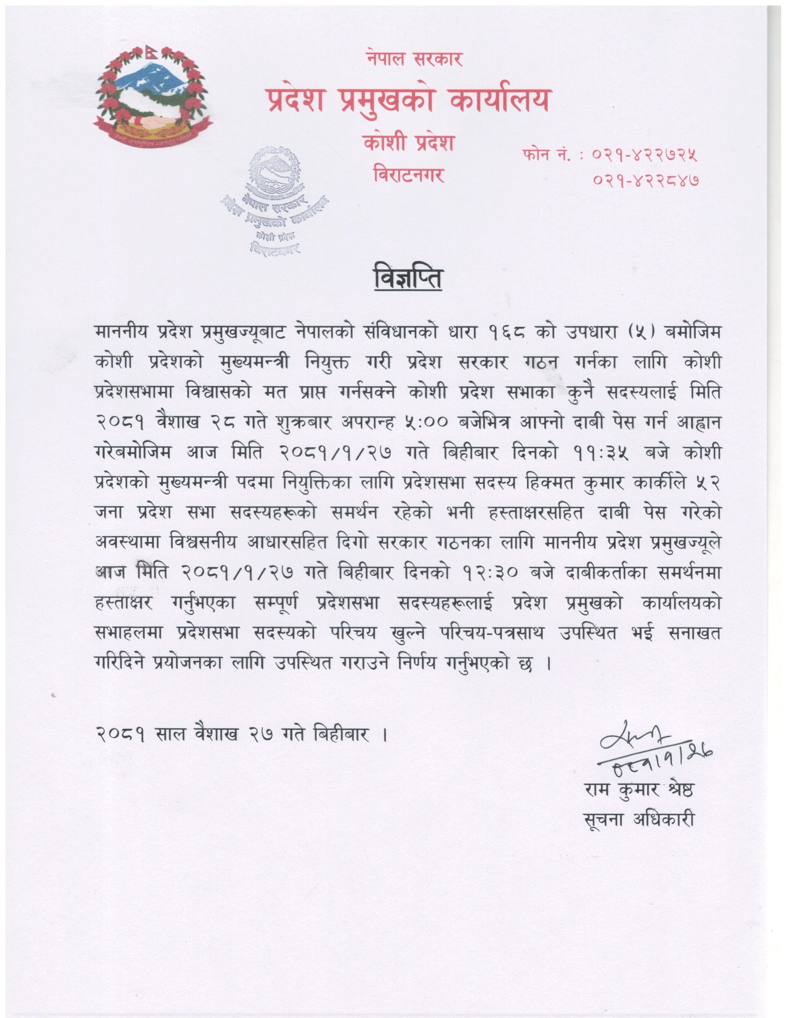 प्रदेश प्रमुखले विहिबार साढे १२ बजे परिचय पत्रसहित प्रदेश प्रमुखको कार्यालयमा उपस्थित भएर सनाखत गर्न आग्रह गरेका छन् ।संविधानको धारा १६८ (५) अन्तर्गत सरकार गठनको आव्हान भएअनुसार गठबन्धनका प्रमुख दलले सरकार गठनका लागि दाबी गरेका हुन् । प्रदेश प्रमुख पर्शुराम खापुङले गएराती शुक्रबार साँझ ५ बजेसम्मको समय दिएर मुख्यमन्त्रीमा दाबी पेस गर्न आह्वान गरेका थिए ।