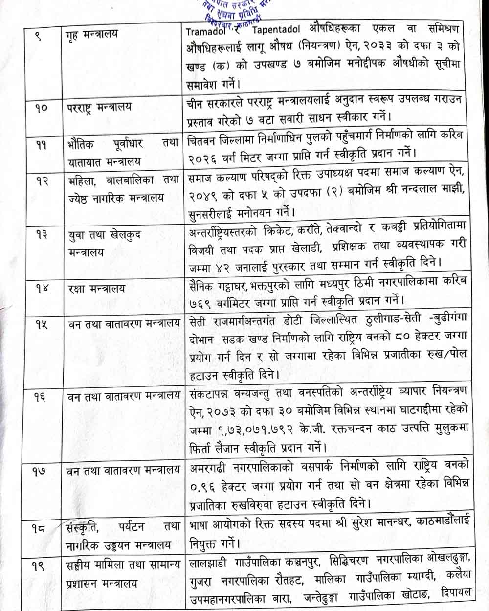 काठमाडौँ । बिहीबार प्रधानमन्त्री तथा मन्त्रिपरिषद्को कार्यालय सिंहदरबारमा बसेको मन्त्रिपरिषद् बैठकले गरेका २५ निर्णय सार्बजनिक गरिएको छ ।सरकारले इजरायल घटनामा निधन भएका ६ जना नेपालीको शव त्रिभुवन अन्तर्राष्ट्रिय विमानस्थलबाट सम्बन्धित ठेगानामा पुर्याउँदाको खर्च २८ लाख ३६ हजार ८३४ रुपैयाँ भुक्तानी गर्ने निर्णय गरेको सञ्चार तथा सूचना प्रविधिमन्त्री रेखा शर्माले जानकारी दिएकी हुन् सरकारका प्रवक्तासमेत रहेकी शर्माका अनुसार मन्त्रिपरिषद् बैठकले विभिन्न निकायमा नियुक्त, सरुवा, मित्रराष्ट्रले दिने अनुदान स्वीकारलगायत २५ निर्णय गरेको छ ।सरकारका निर्णय: