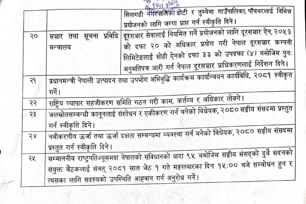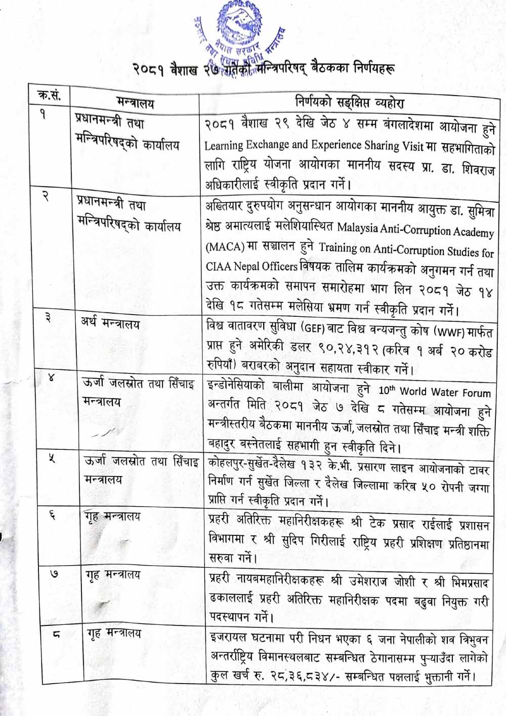 काठमाडौँ । बिहीबार प्रधानमन्त्री तथा मन्त्रिपरिषद्को कार्यालय सिंहदरबारमा बसेको मन्त्रिपरिषद् बैठकले गरेका २५ निर्णय सार्बजनिक गरिएको छ ।सरकारले इजरायल घटनामा निधन भएका ६ जना नेपालीको शव त्रिभुवन अन्तर्राष्ट्रिय विमानस्थलबाट सम्बन्धित ठेगानामा पुर्याउँदाको खर्च २८ लाख ३६ हजार ८३४ रुपैयाँ भुक्तानी गर्ने निर्णय गरेको सञ्चार तथा सूचना प्रविधिमन्त्री रेखा शर्माले जानकारी दिएकी हुन् सरकारका प्रवक्तासमेत रहेकी शर्माका अनुसार मन्त्रिपरिषद् बैठकले विभिन्न निकायमा नियुक्त, सरुवा, मित्रराष्ट्रले दिने अनुदान स्वीकारलगायत २५ निर्णय गरेको छ ।सरकारका निर्णय: