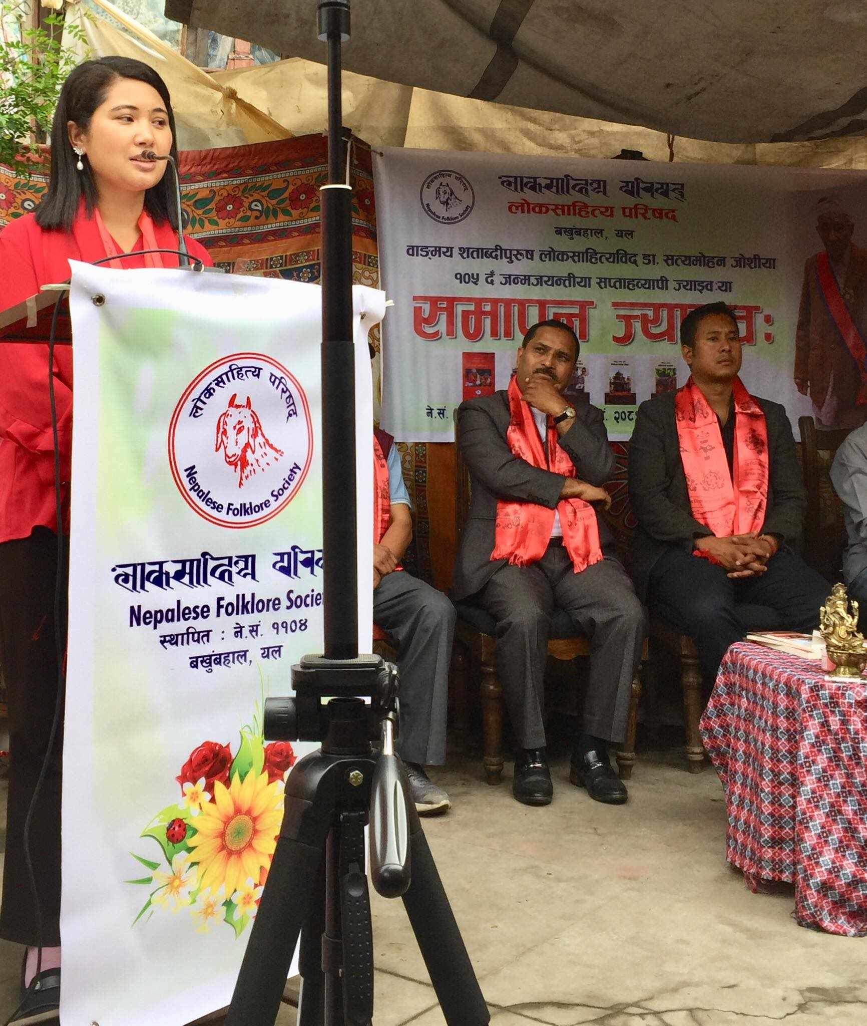 काठमाडौ । शताव्दी पुरुष स्वर्गीय सत्यमोहन जोशीको तस्वीरलाई सगरमाथाको चुचुरोमा पुयाएबापत सगरमाथा आरोही कल्पना महर्जन सम्मानित भएकी छन् । बाङमय शताव्दी पुरुष, लोकसाहित्यकार डा सत्यमोहन जोशीको एक सय पाँंचौं वर्षको जन्मजययन्तीको सप्ताहव्यापी समापन कार्यक्रममा राजधानीमा आयोजित कार्यक्रममा महर्जनलाई सम्मान गरिएको हो ।